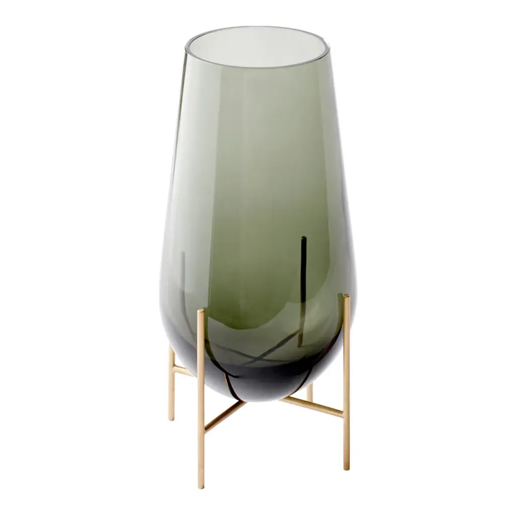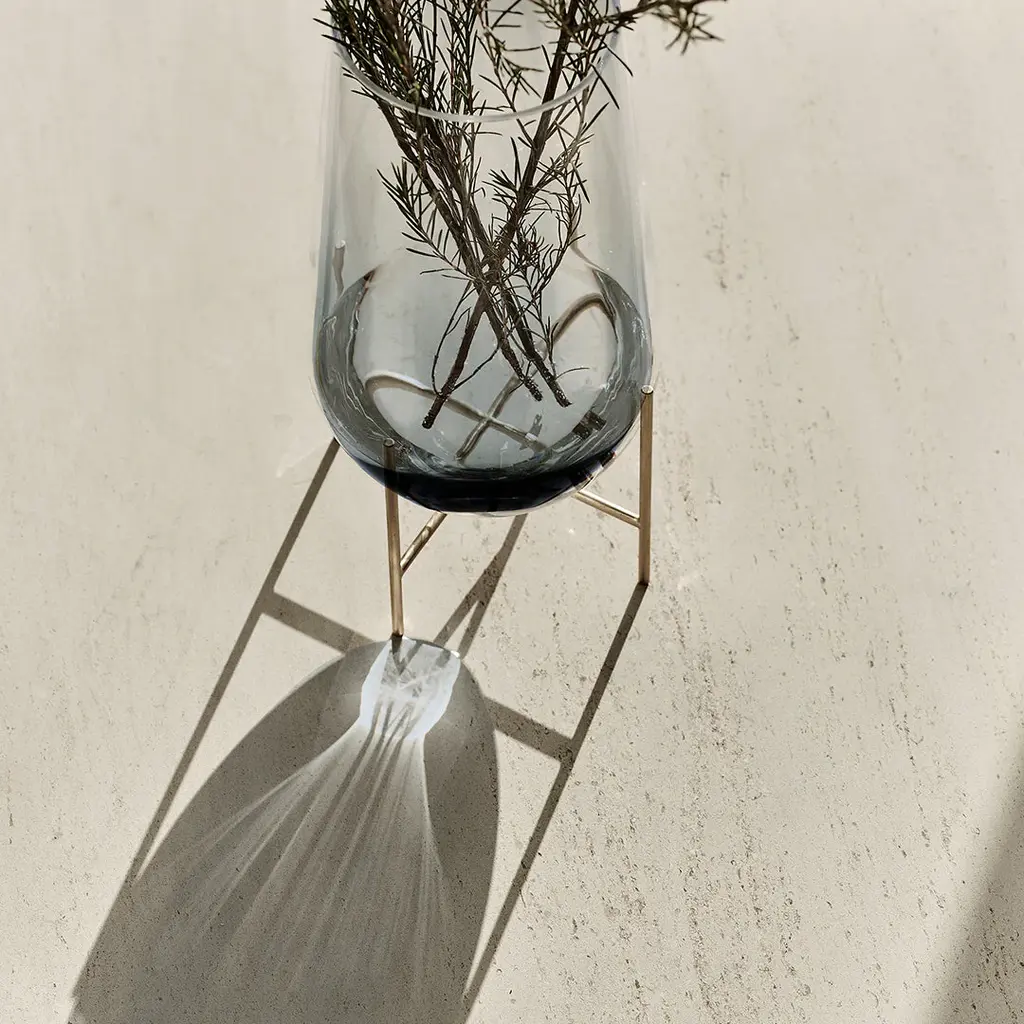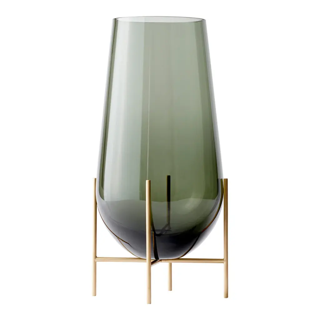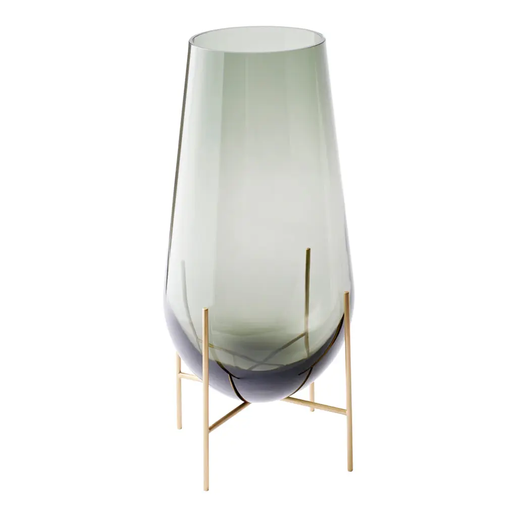The Echasse Vase combines the classic elegance of a traditional glass vase with a playful, light expression. The word 'echasse' is French for stilts, and this round-bottomed vase is anchored to the table by four slender legs that resemble stilts. The vase takes inspiration from test tubes in laboratories, and like the original the Echasse has a classic drop-like shape, constructed from colored glass that gives the vase a unique expression. Echasse is available in a large version, which stands on the floor.
