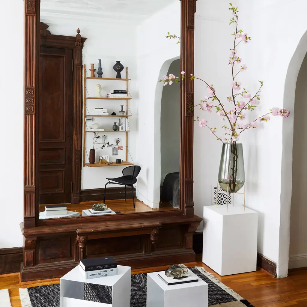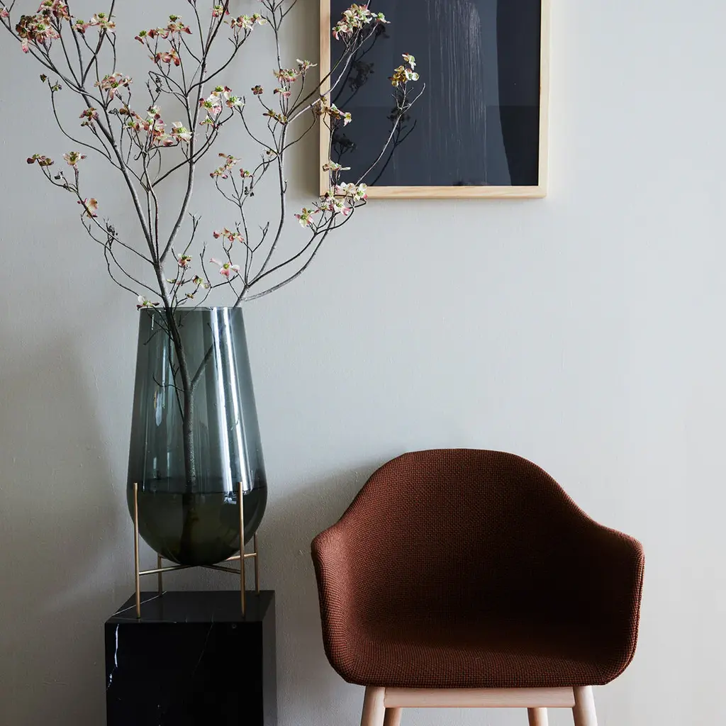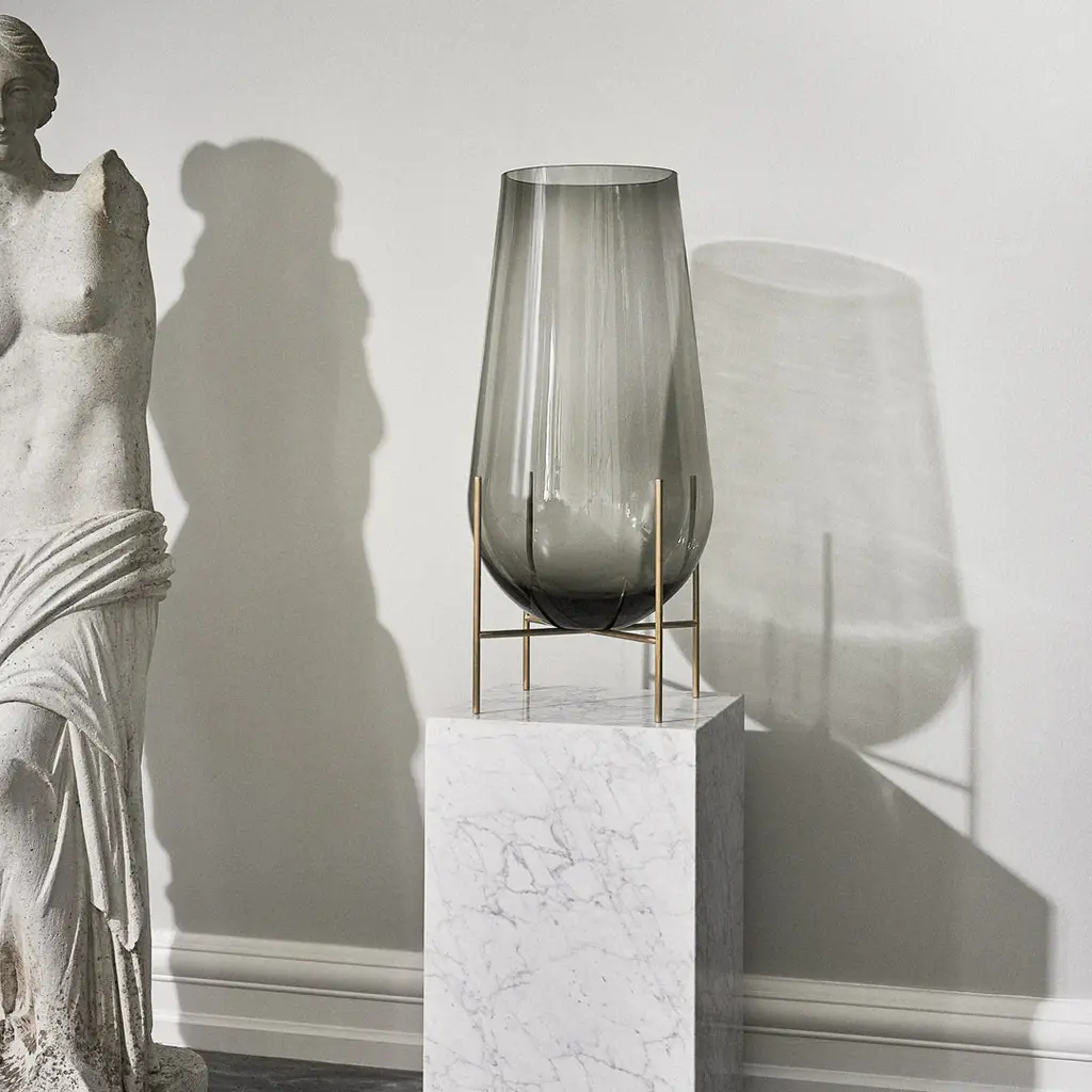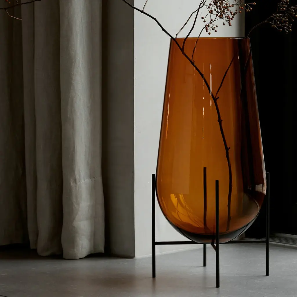 The Echasse Vase combines the classic elegance of a traditional glass vase with a playful, light expression. The word 'echasse' is French for stilts, and this round-bottomed vase is anchored to the table by four slender legs that resemble stilts. The vase takes inspiration from test tubes in laboratories, and like the original the Echasse has a classic drop-like shape, constructed from colored glass that gives the vase a unique expression. Echasse is available in a large version, which stands on the floor.