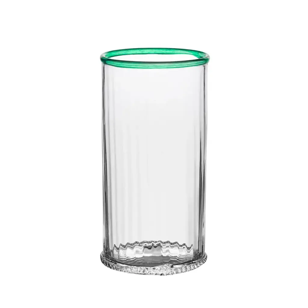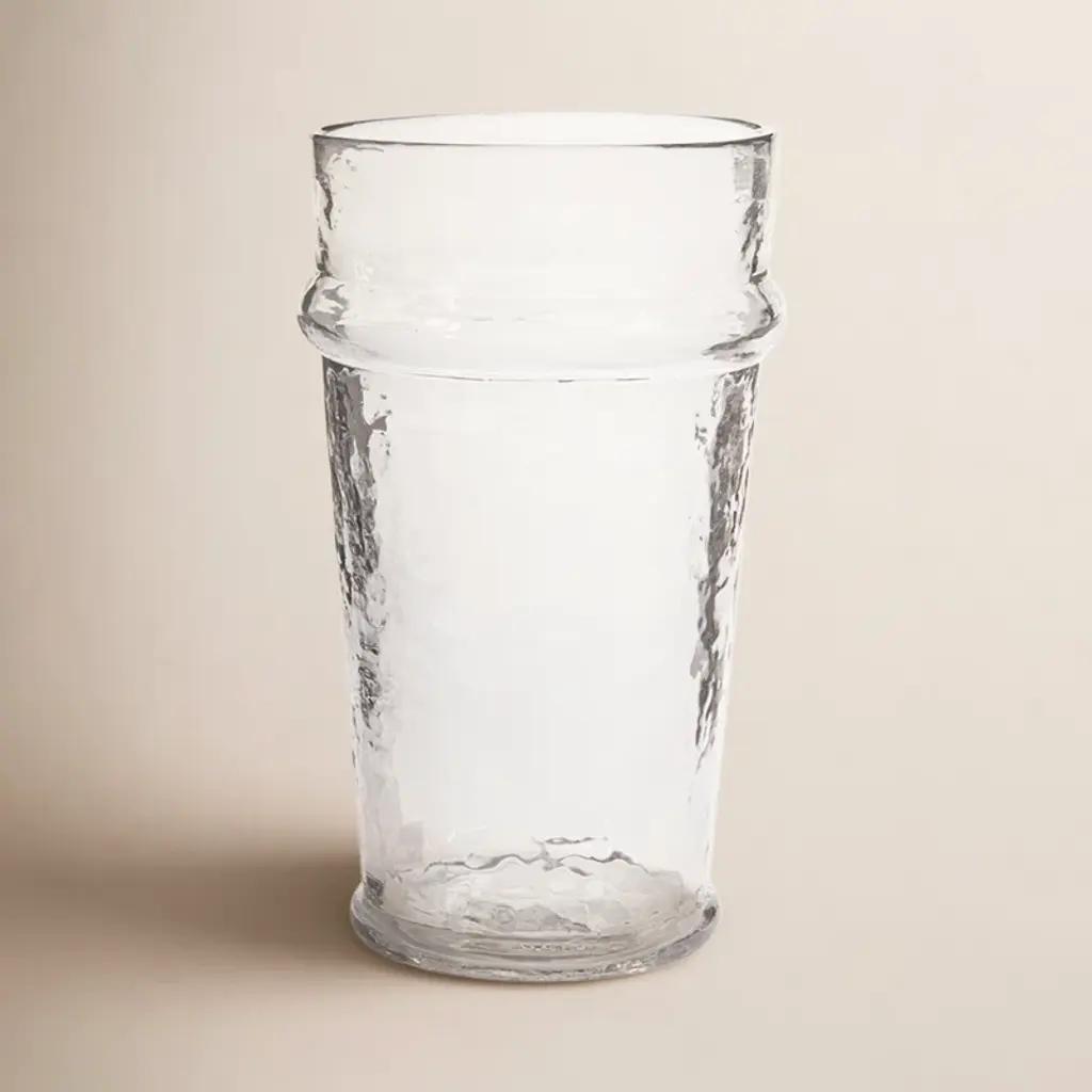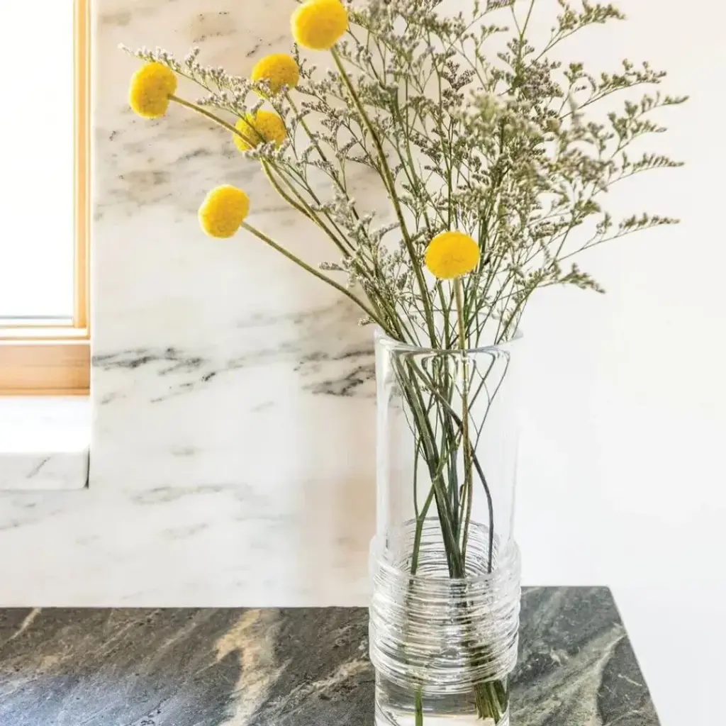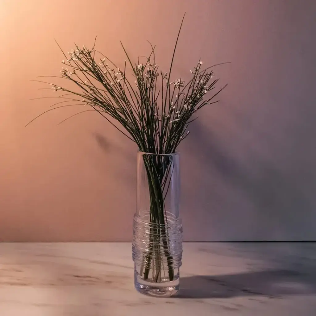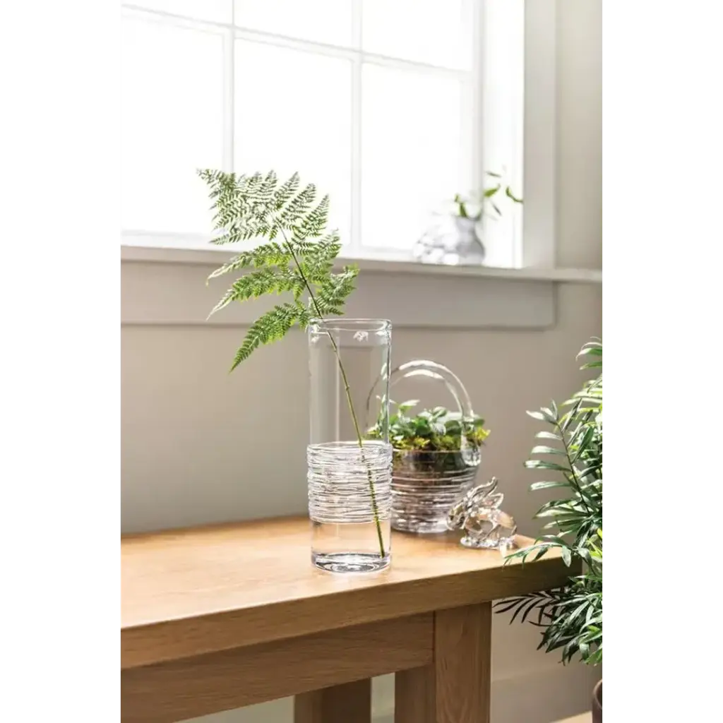 Inspired by the constantly changing Vermont waterways, our master glassblowers nimbly wrap fine strands of glass around a section of this cylindrical vase for a textural juxtaposition to the brilliant clear glass above and below. At Simon Pearce, fine glassware is still hand-blown in the traditional style. Simon Pearce opened his first glassblowing shop in 1971 in Kilkenny, Ireland. Ten years later, the factory was moved to Quechee, Vermont, where it remains today. The Ottauquechee River provides clean, hydroelectric power for the facility. All Simon Pearce items are proudly made in the U.S.A.