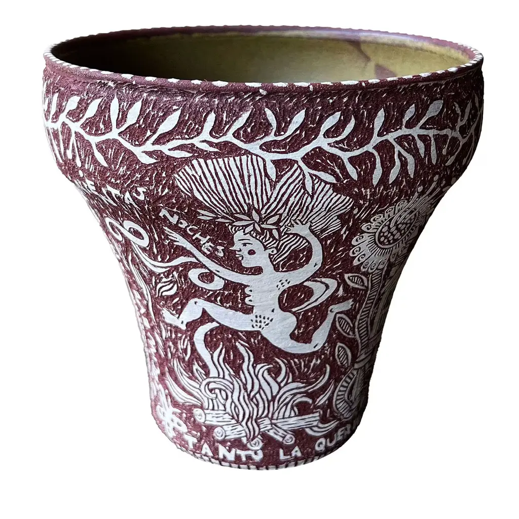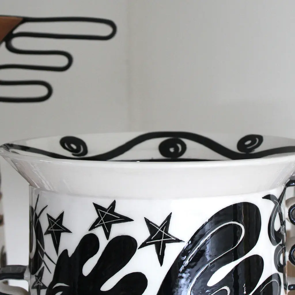 The serpent god, symbolized by the handle, enchants vases and illustrations inspired by the Maya. This handcrafted clay vase features a matte black glaze and waxed terracotta finish, adorned with hand-painted glossy white and black decorations. A fusion of mythology, artistry, and timeless design. Design by Jean-Christophe Clair.