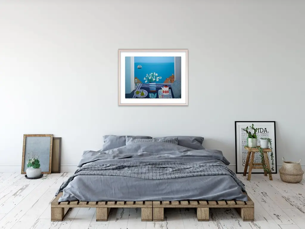 Seen first at One Kings Lane: This work from Emma Williams features a tabletop vignette in the foreground with a lovely seascape in the distance. Printed on watercolor paper with deckled edges, floated over a mat, and simply framed, this piece arrives ready to hang.Irish-born painter Emma Williams is continuously inspired by pattern and color, as well as the exceptional natural beauty of the Cornish coast. Her textured works are celebrated for their distinctive style and evoke a particular time and mood with their vibrant color and flattened perspective.