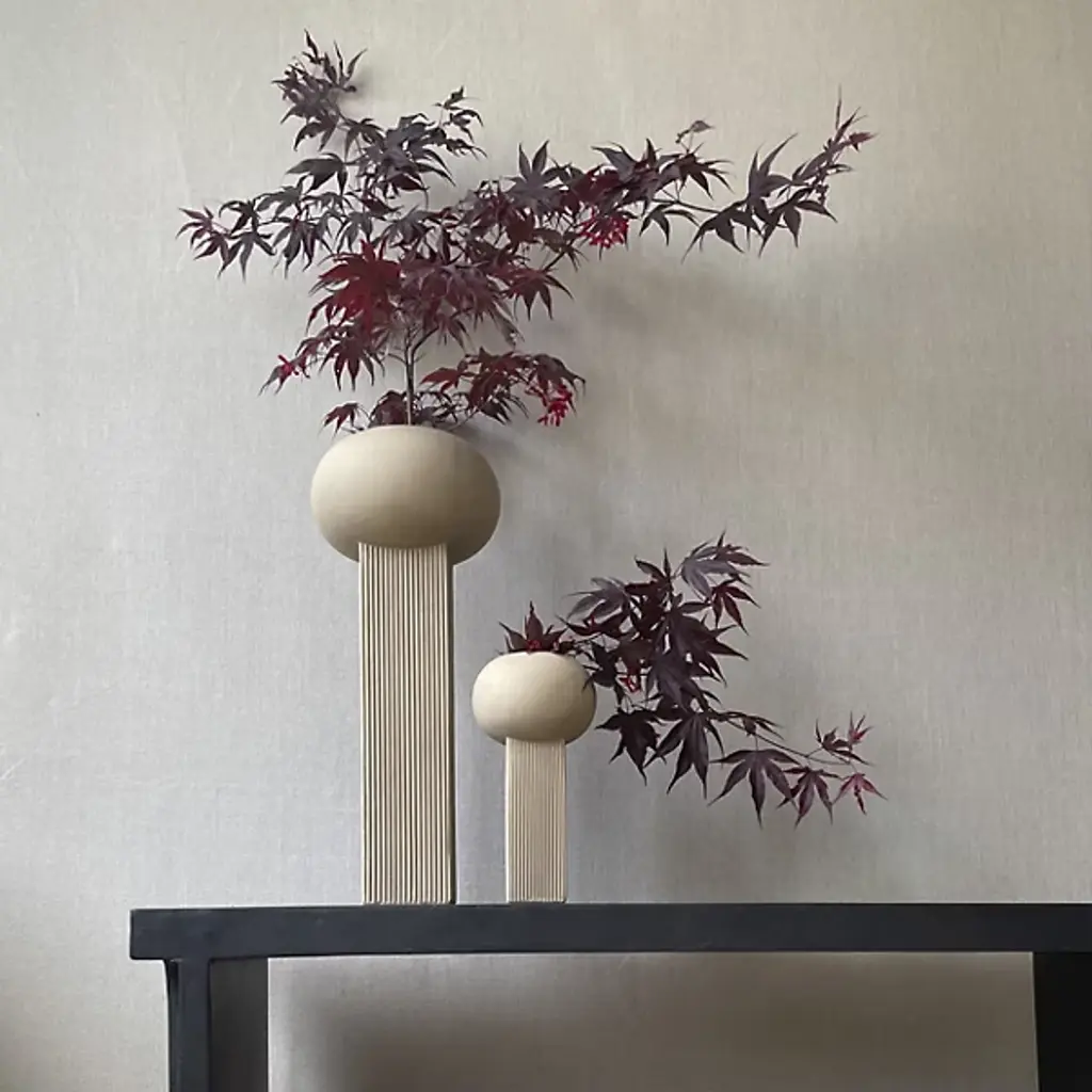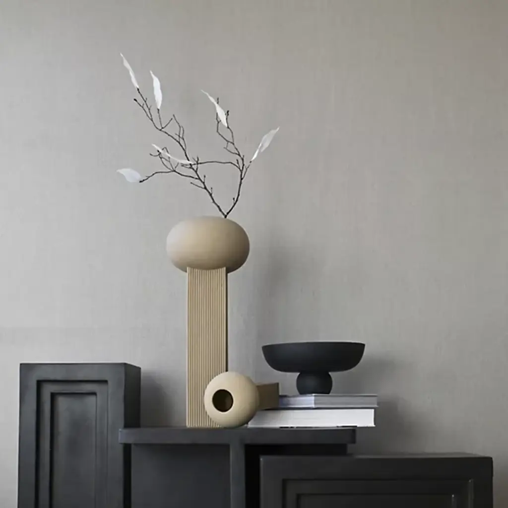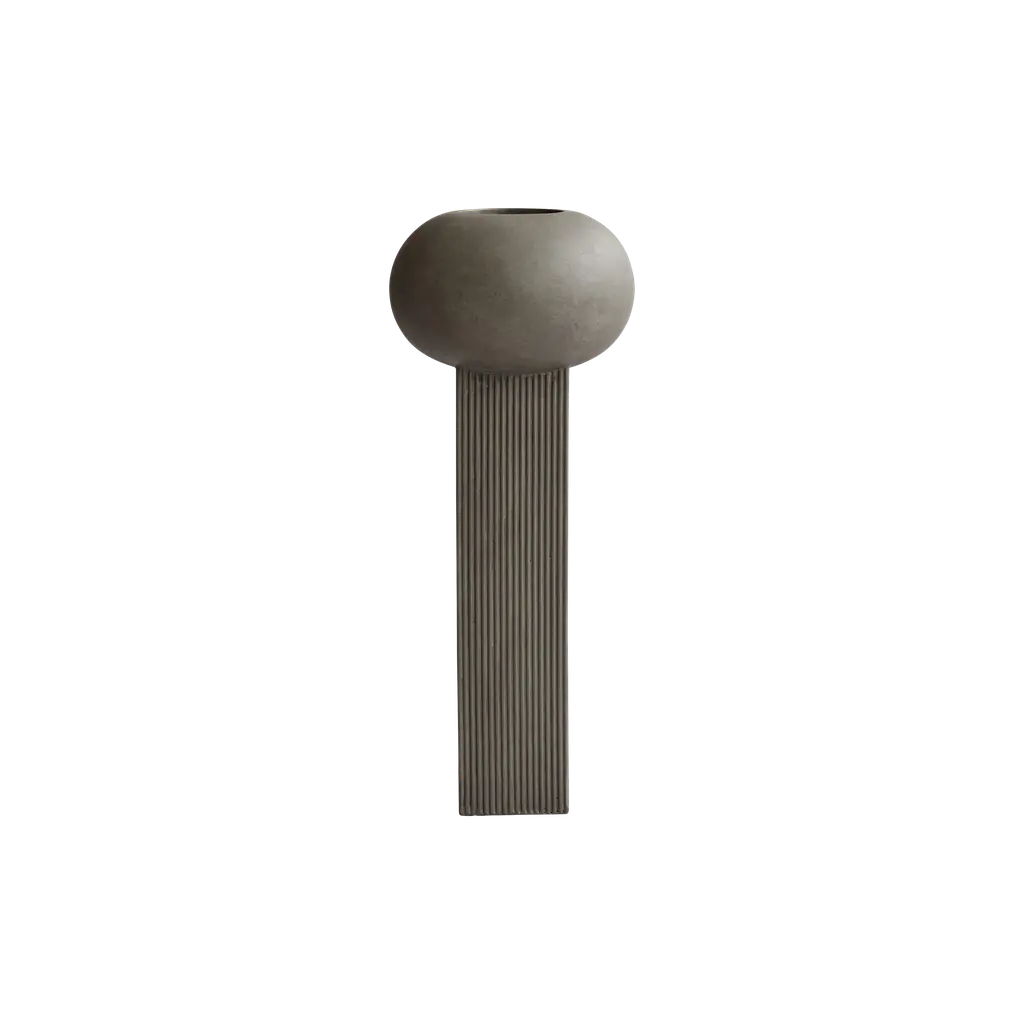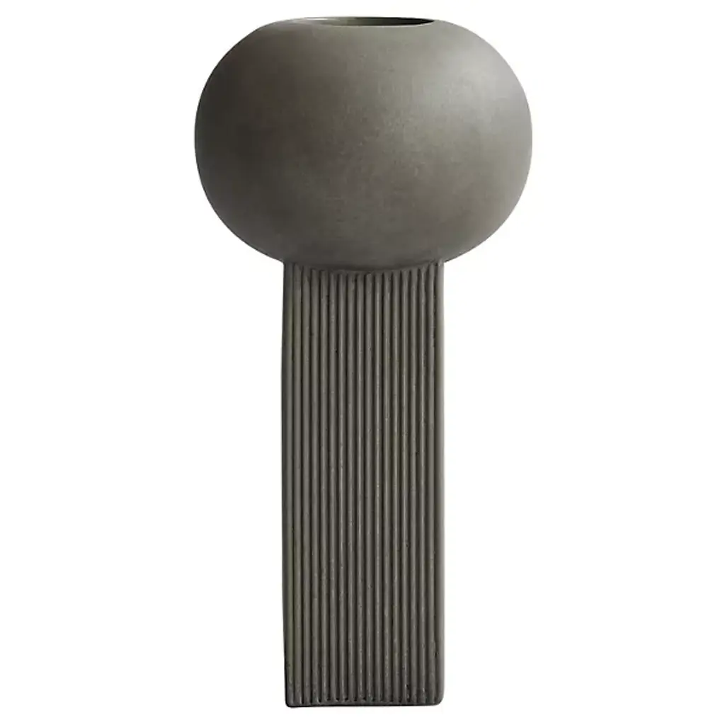 The Empire Vase from 101 Copenhagen brings architectural elegance to flat surfaces with its slim, vertical design utilizing vertical accents inspired by building facades. Designed by Kristian Sofus Hansen and Tommy Hyldahl, each piece is made from ceramic with a hand-glazed finish. Each vase features a vertically lined surface that plays with the way light and shadow shift throughout the day. The simple form is ideal for tall floral arrangements or long branches, and it includes a protective bag for fresh flowers, ensuring both beauty and long-lasting function.
