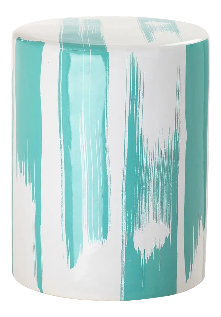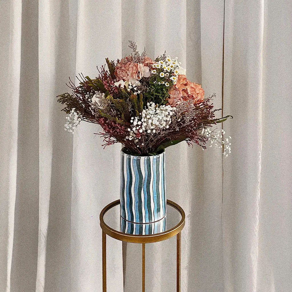 Freshness and simplicity define the eye-catching look of this ceramic vase, its cylindrical body attesting to its minimalist inspiration. Wavy stripes hand-painted in turquoise and green add dynamism to the otherwise dull total-white surface. Any slight imperfection and difference from the pictured item are to be expected and treasured as proof of uniqueness.