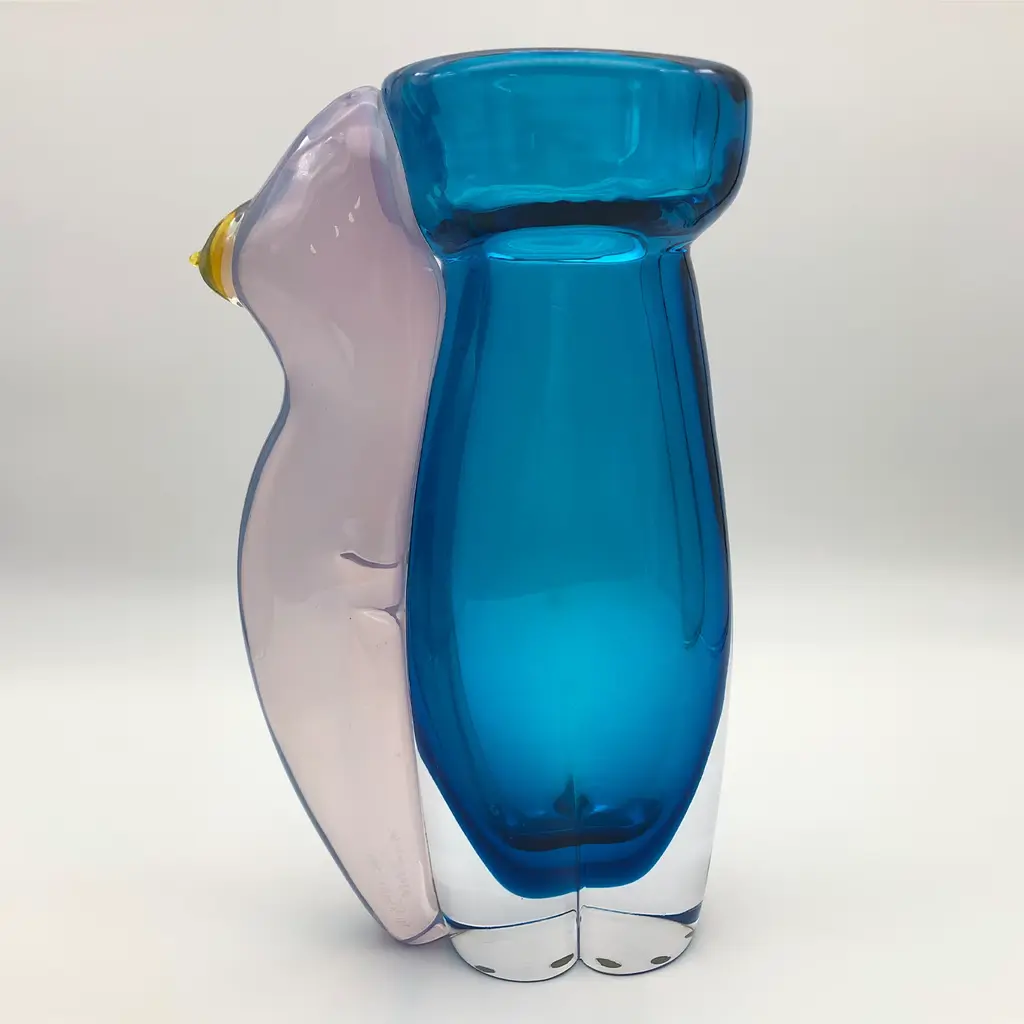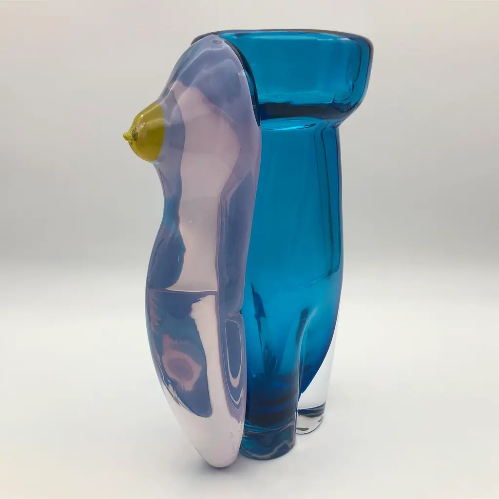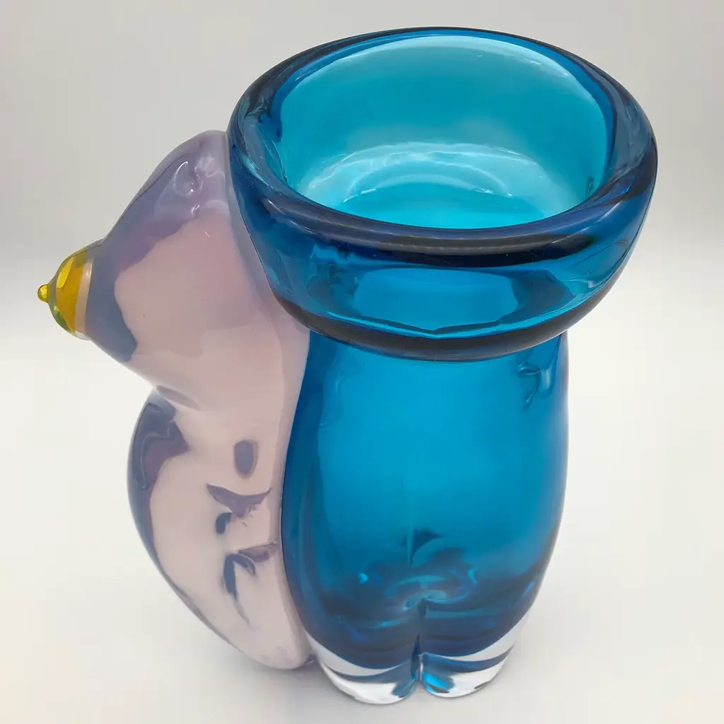 Named after the Greek God of Love, this magnificent vase will infuse a charming accent of contemporary flair in any decor. Deftly handcrafted by master glassmaker Toso Cristiano, it is fashioned of opaline ruby glass and aquamarine clear glass, showcasing sinuous lines inspired by a naked body, enhanced with a bright yellow accent recalling a nipple.