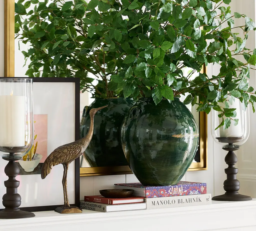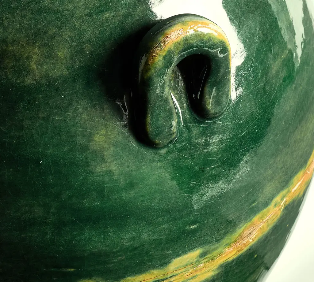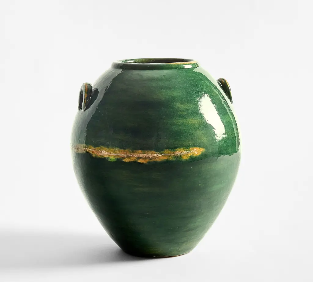 Green accents ground a room and connect us to nature. Handcrafted from terracotta and finished with a high-gloss glaze, the jewel-like color of this vase enriches the space around it, whether styled on its own or brimming with botanicals.