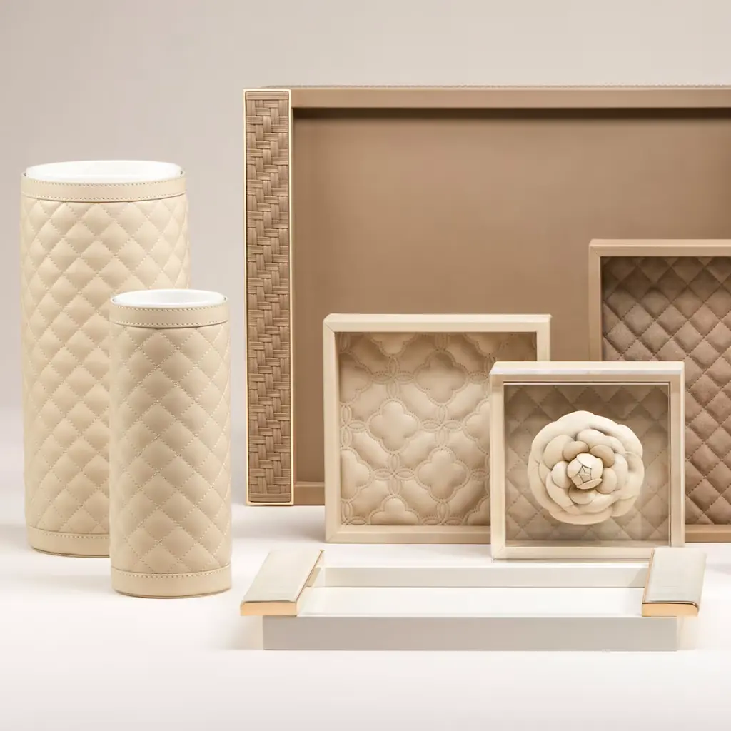 Ester is an exquisite collection of ceramic vases covered with a removable leather cover. Three sizes, three different leather patterns, and, of course, seventeen colors of leather with which to customize them. Removable quilted diamond padded leather cover.