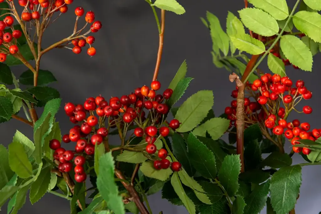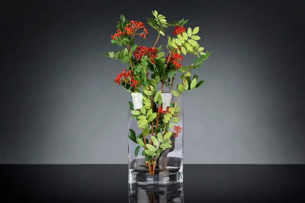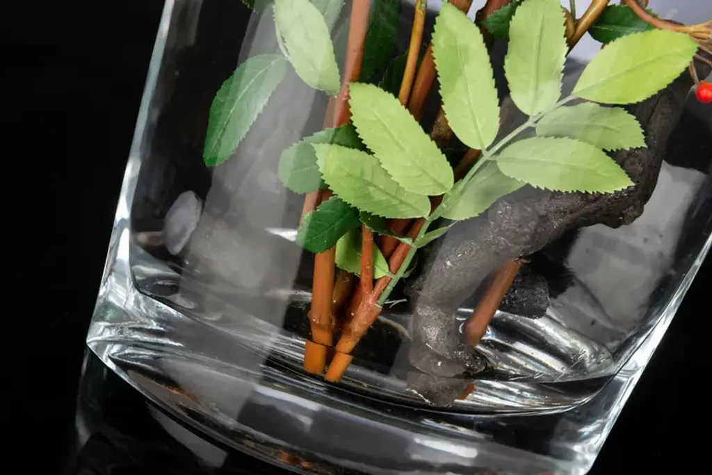 Eternity Vase Tear Berries is a faux flower arrangement in glass vase with artificial flowers and “water illusion”, created by floral designers. Ideal for interior decor or weddings and events setting.