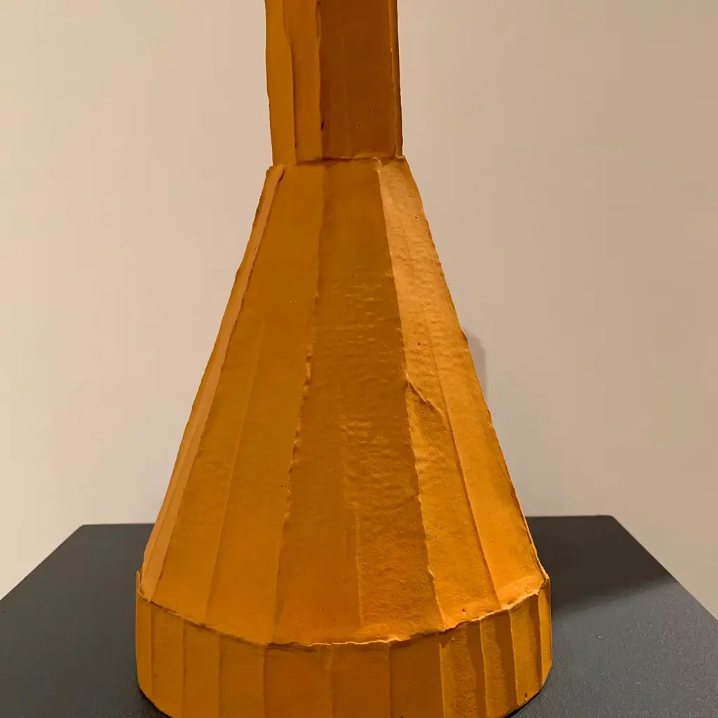 Inspired by the conical shape of a volcano, this unique vase is an eye-catching addition to a modern or eclectic interior. Its asymmetrical silhouette is handmade using a complex method to creates the irregular shape that is finished with a paper-like texture in a rust color. A striking accent on a console, mantlepiece, or bookshelf, this piece can be combined with others in the same style for a dynamic effect. Every one of Paola Paronetto’s creations is unique. Slight variations in shape, colour and size are to be considered a guarantee of authenticity and value. They are finished with non-toxic satin-finish enamels. Although very rarely, it is possible for them to leak after long periods of exposure to water. It is therefore advisable to test their water resistance before using them on delicate surfaces. They should not be used as dining utensils. The white pieces can be washed with water or sanitizing products, whereas the coloured pieces must be treated more gently and cleaned with a feather duster or a soft cloth, dry or moistened very slightly with water.