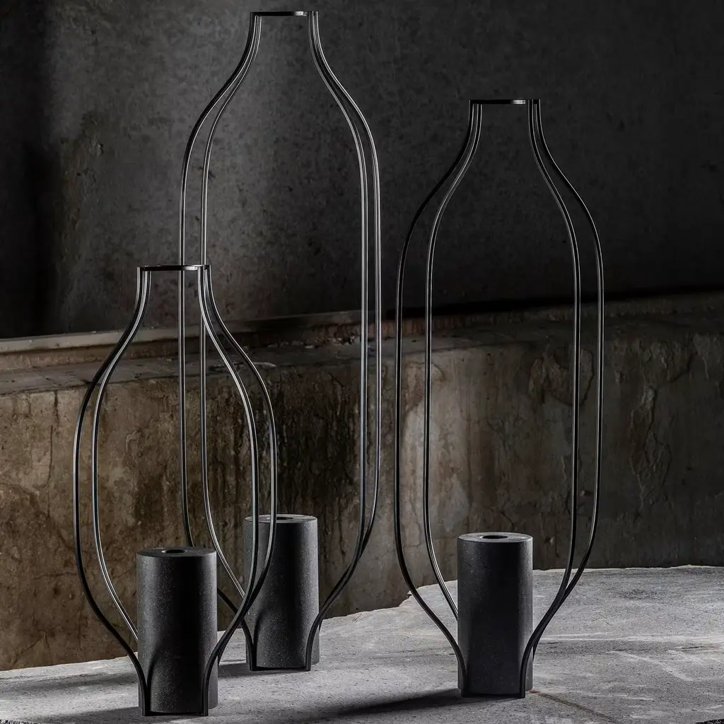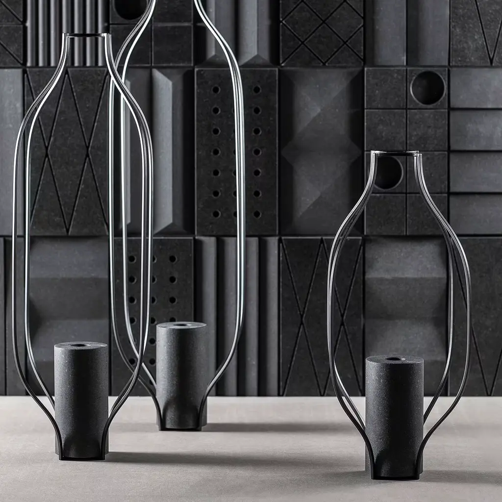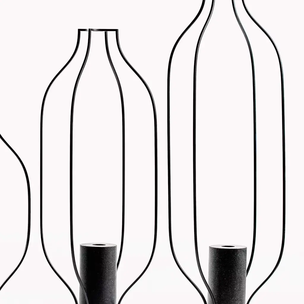 Part of the Tarsie Geometriche Collection, this vase combines iron, varnished with an opaque black powder, and honed-finished volcanic stone. The two elements merge to create a vase that is dynamic and striking. The stone is adorned inside with color mastic filler, traditionally used to repair marble. A medium and a large versions are also available.