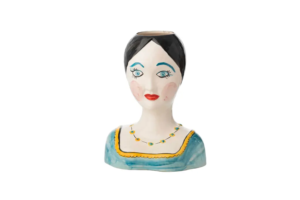 This is a real conversation piece that can go on and on. Filled with tall greens or fruit, it makes a statement. Check out Gabriel Painted Head Vase, item #403410.