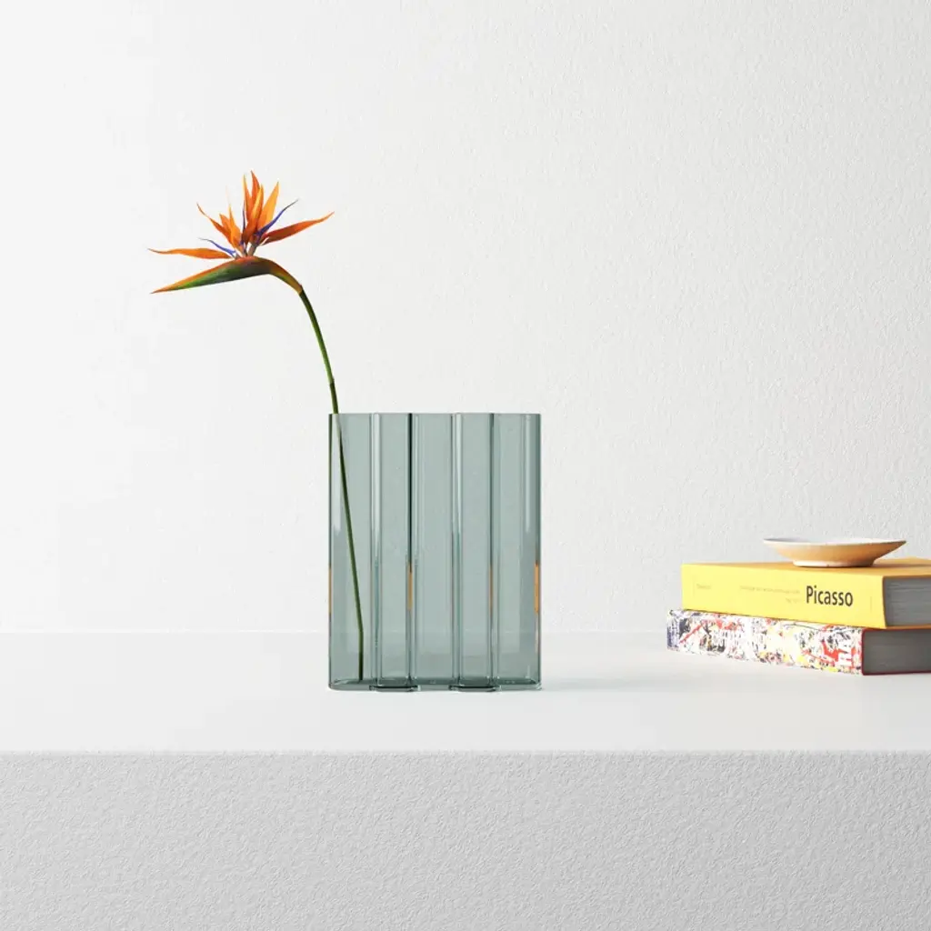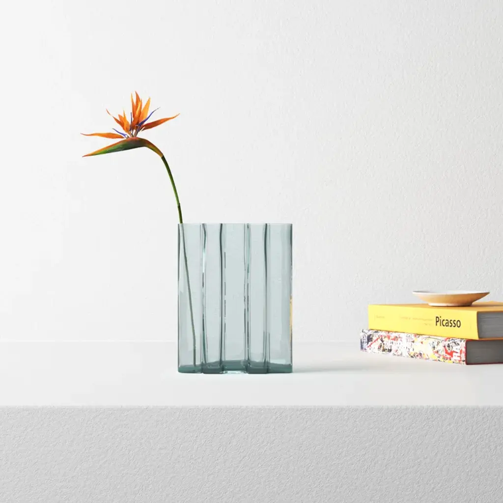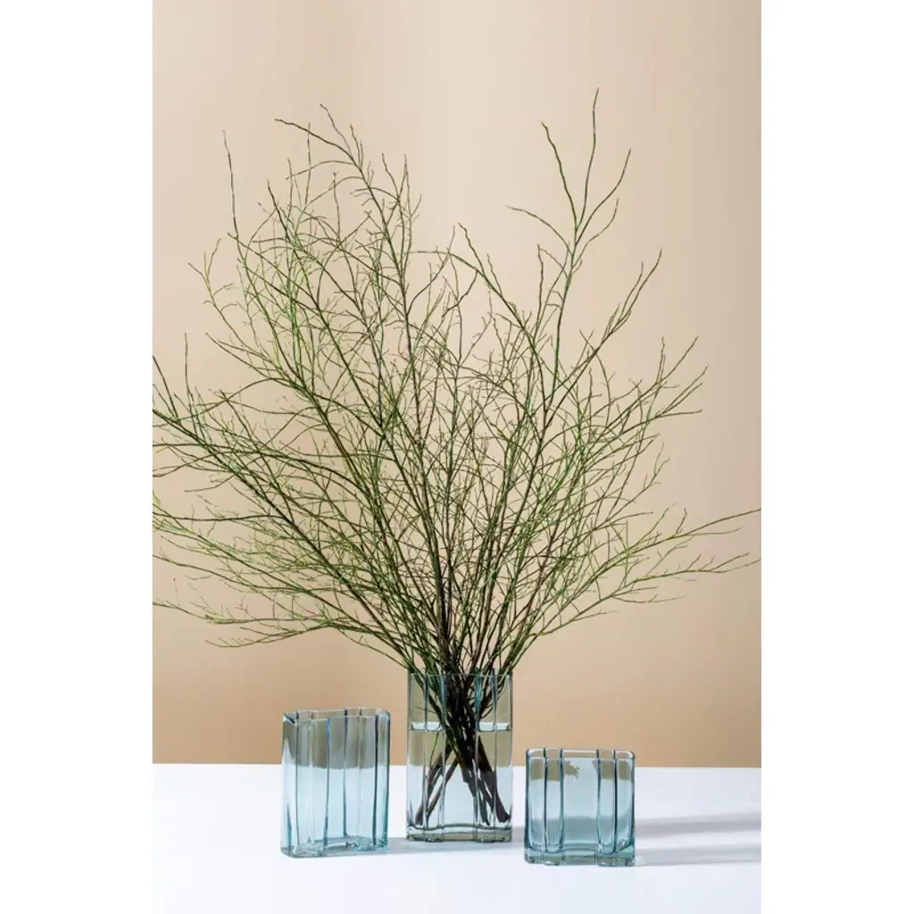 The asymmetrical Evanne Vase with its sleek lines is a stunning art piece for your shelves, as well as a chic vase for fresh-cut or dried bouquets. This handmade glass piece has a subtle bluish-green hue that enhances any decor.