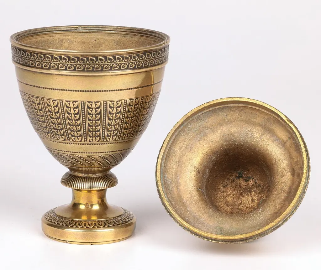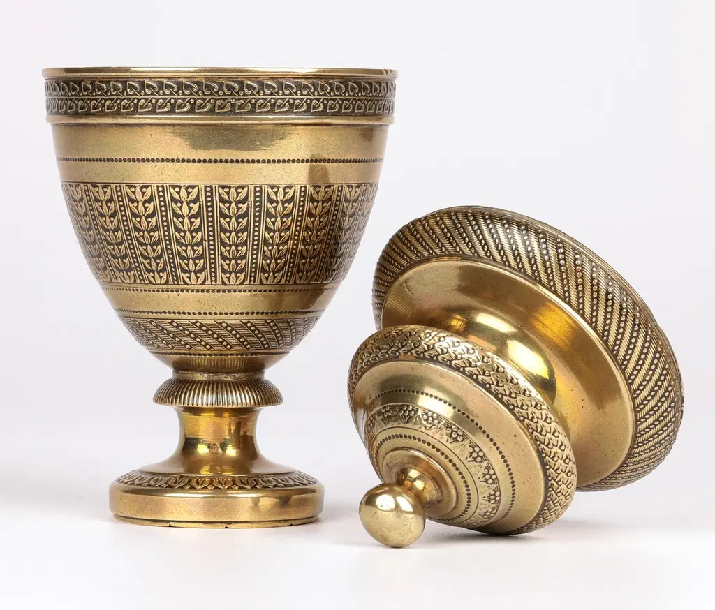An exceptional quality antique Southeast Asian brass lidded urn dating from the 19th century. The heavily made urn stands raised on a narrow round pedestal foot with a short narrow knop stem with a goblet shaped body and screw on domed cover with a large and ornate raised finial. The urn has very fine engine turned detailed intricate patterning with extensive stylized banding around the foot, body and cover. The urn has a polished brass finish and is not marked and is a wonderful display piece.Provenance: acquired in the UK Art Market.In good condition with wear associated with age and use with slight misshapen irregularities around the foot. The screw on the top is also worn and slightly harder to locate. Height 14cm, Diameter 7cm