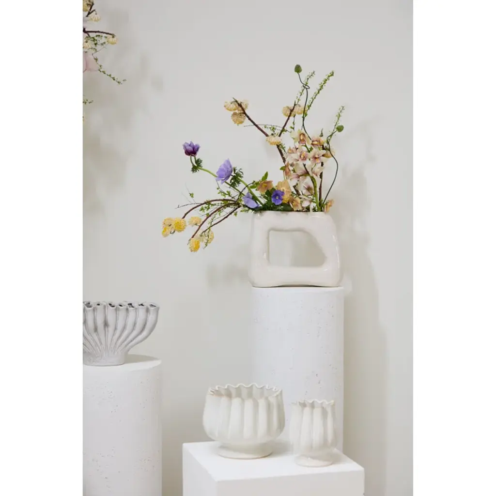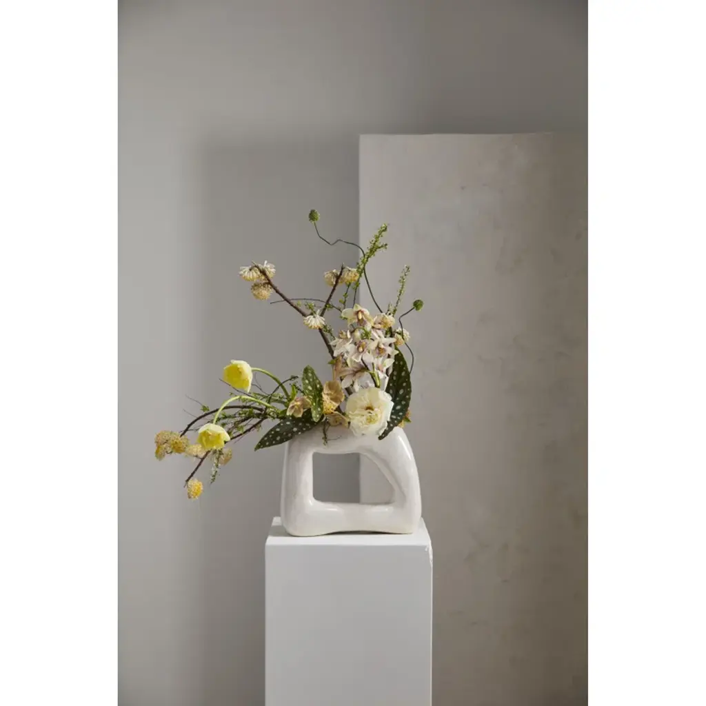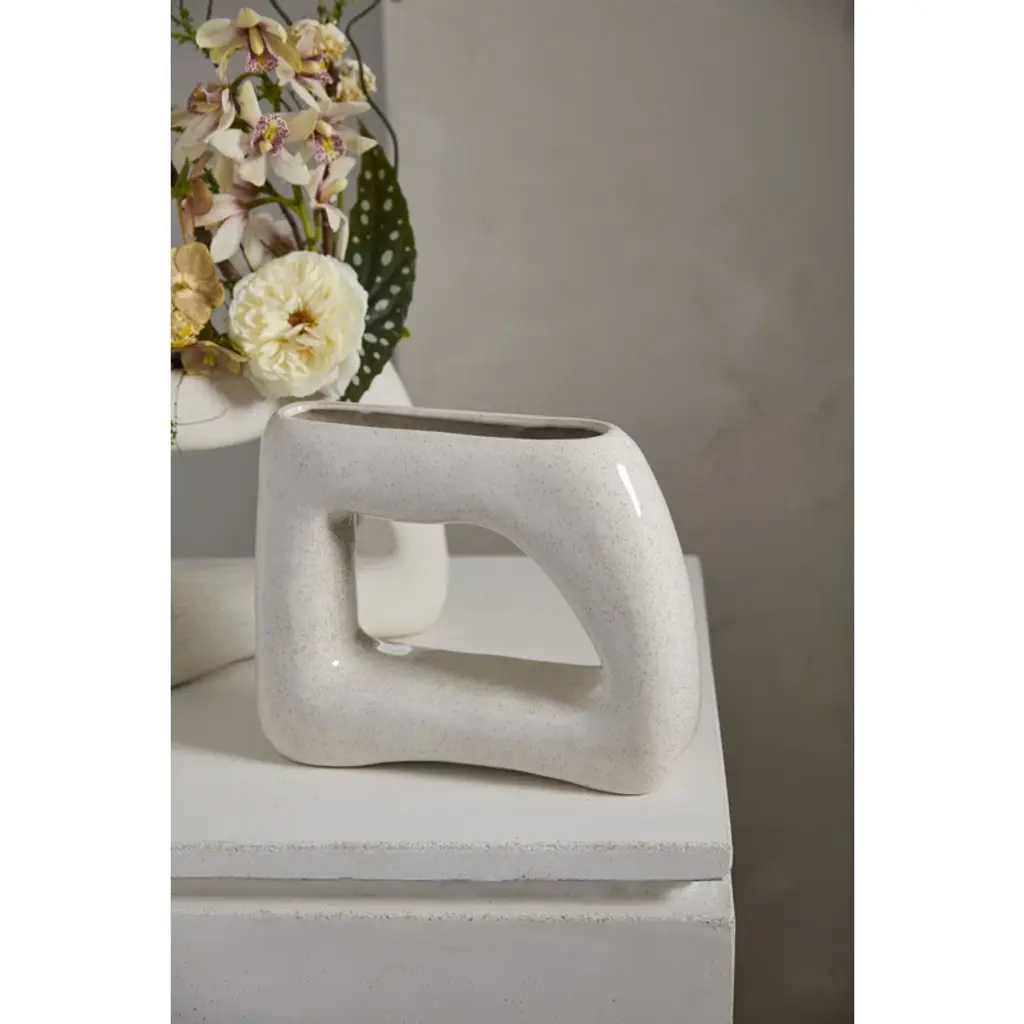 Bring sculptural interest to home shelving or to floral design with the Expanse Vase. This unique vase features a rectangular shaped opening, depth on either side for stems & water, & a shallow top center. Functional for modern design & interesting as a decorative piece, this ceramic vase with its light speckling & glossy finish is a fun variation on the common vase for retail florists or wedding & event design.