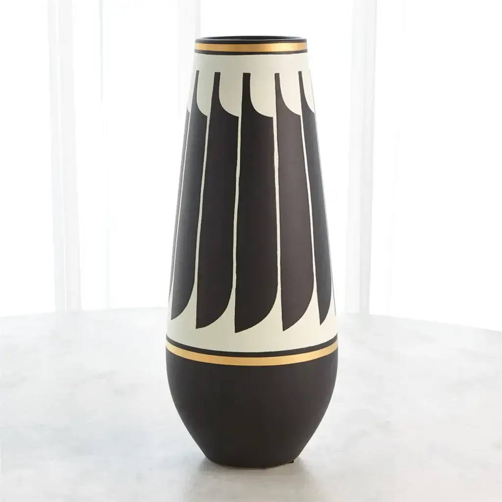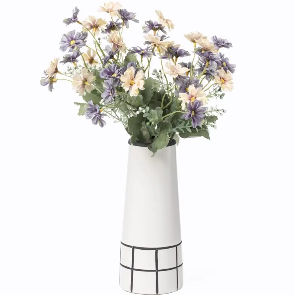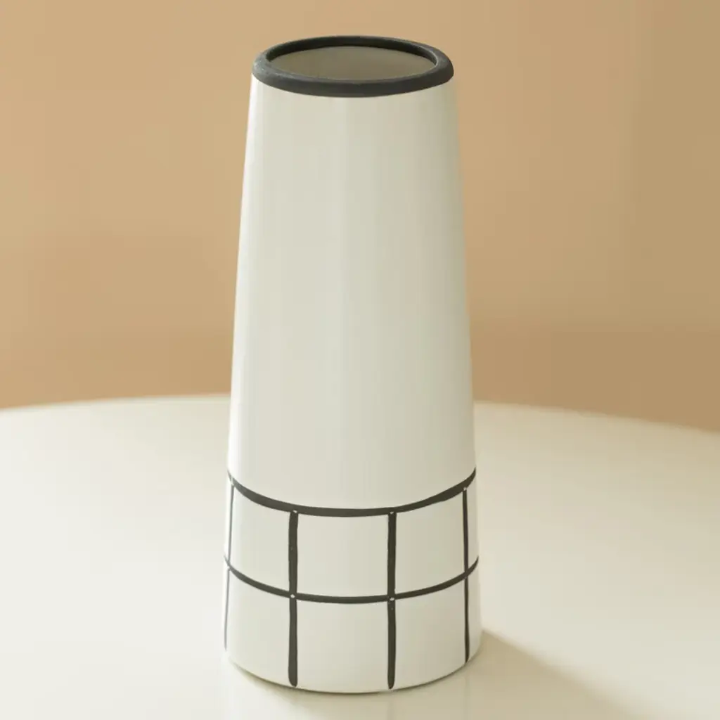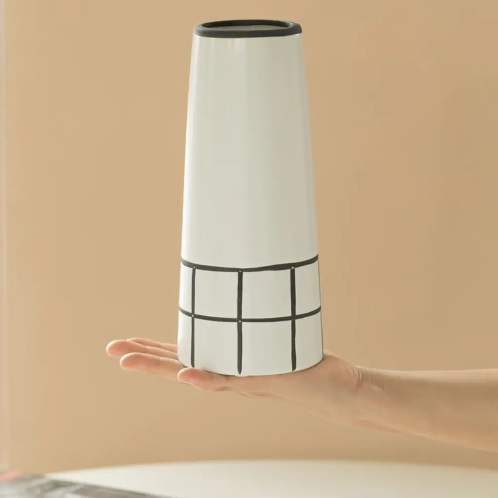 Add an elegant touch and beautiful art to your home with this modern table flower vase. It is made of 100% ceramic material with a unique black grid brushstroke design. This centerpiece is completely watertight, with no drainage hole to keep your flowers fresh. Ideal to use as a flower vase, statue, table centerpiece or even as a modern desktop organizer to accommodate your specific needs. Suitable for various fillers such as dried or silk flowers, branches, feathers, or pearls. Whether you display it in your bedroom, office, or dining table, itll bring your home dcor to the next level.