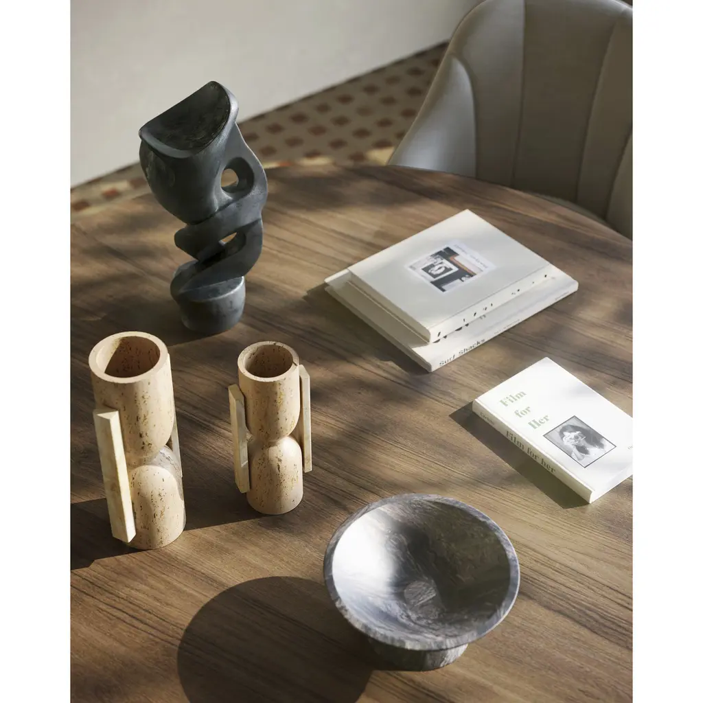 The Stone Vase, Face to Face Set includes two modern iterations of brutalist sculptures made of hand-carved travertine. The geometric vessels are solid on the bottom and hollowed out on top to create a vase-like opening. They are not meant for floral arrangements, as they are not water-tight. Note that the surfaces will vary from piece to piece.