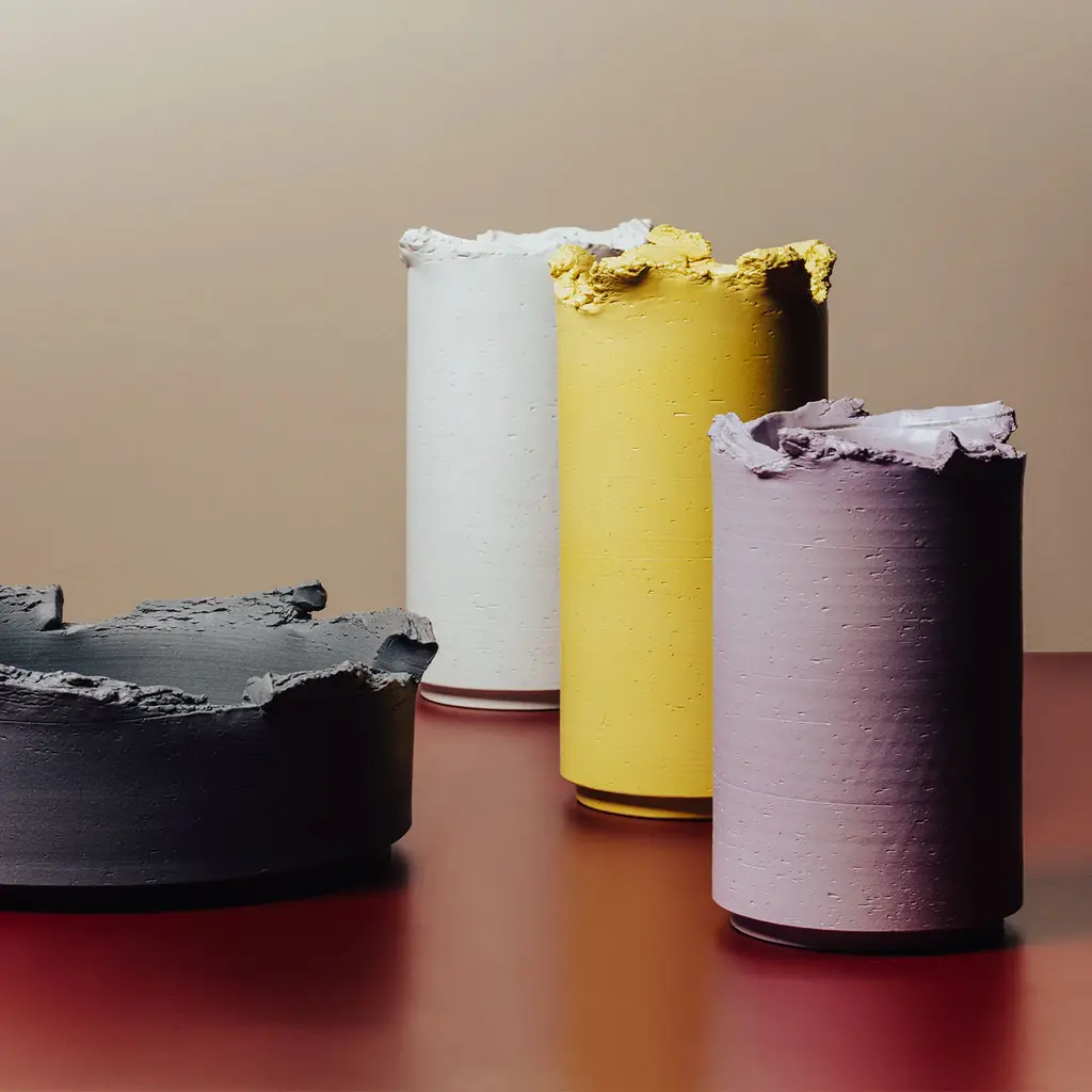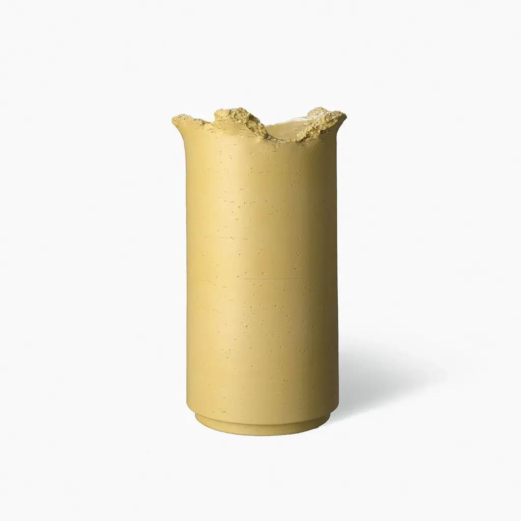 A perfect synthesis between modern and contemporary influences, this cylindrical ceramic vase - showcased at the 2019 Milan Design Week - is painted in a light yet vibrant shade of yellow. An outstanding feature is the torn aspect of the upper border, while the base results slightly tapered.