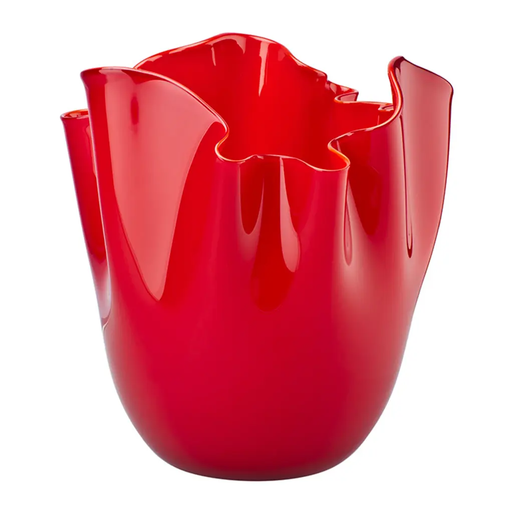 This mouth-blown vase has a flowing silhouette created with a complex method whereby the glass is hand shaped with fabric-like folds to evoke the image of a handkerchief ("fazzoletto" in Italian). This coveted design features a vivid red color obtained with the opaline technique.