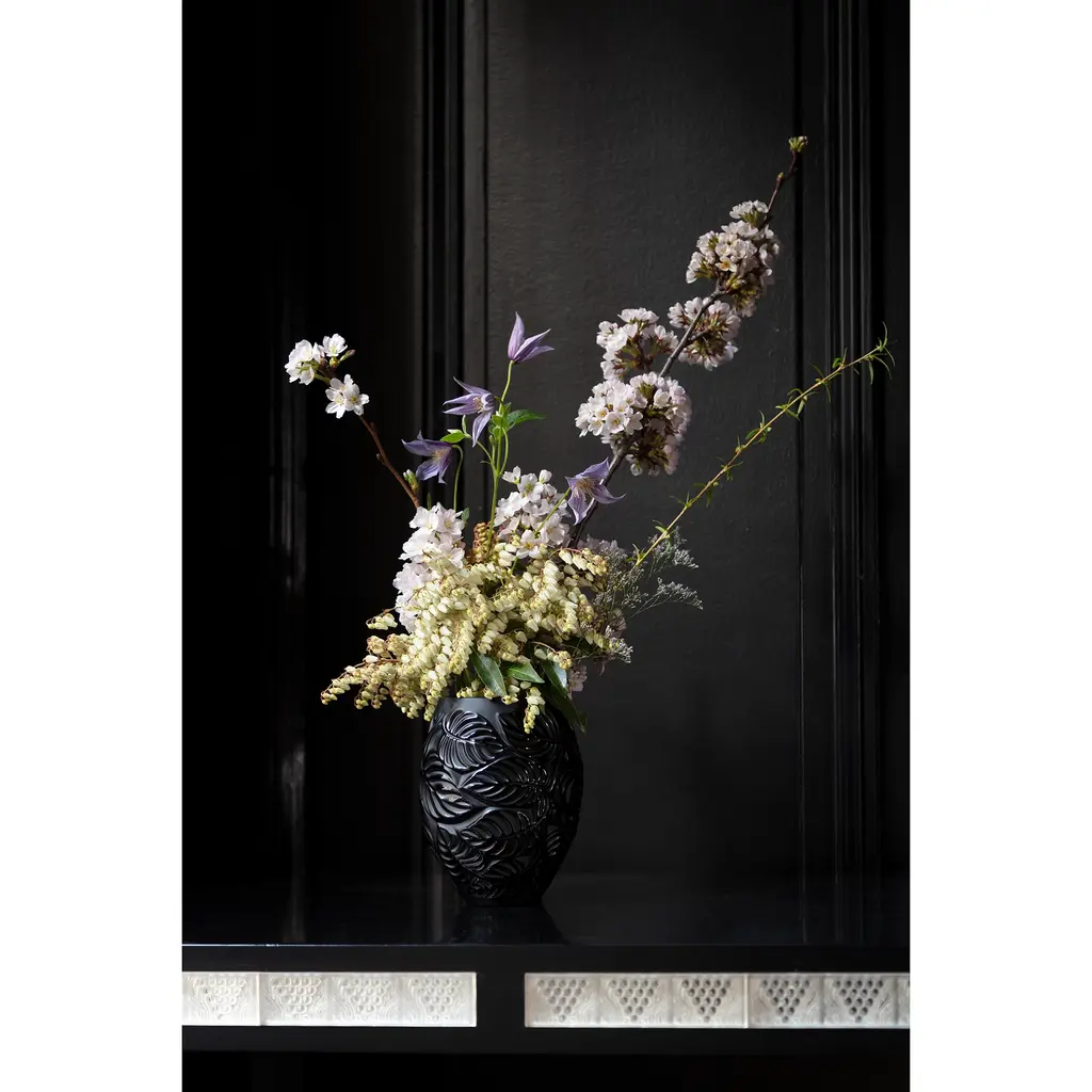 Heart-shaped pepper leaves beautifully adorn the "Feuilles" crystal vase and votive by Lalique. The climbing vine had already inspired the design of the salt and pepper mill co-signed by Rene Lalique and Peugeot in 1924 and has been reproduced in celebration of the Villa Rene Lalique opening.