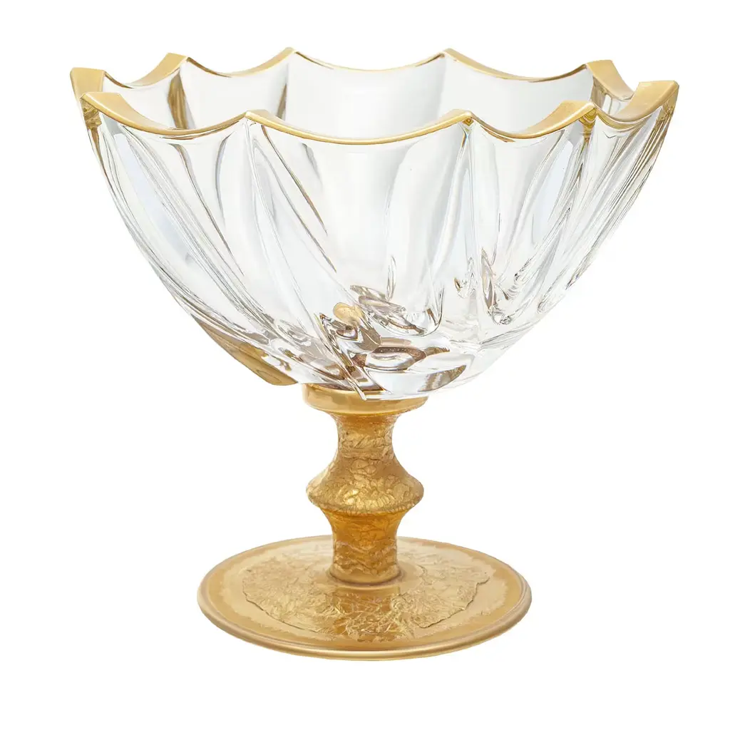Elevate your decor with this stunning crystal vase, meticulously crafted to add a touch of timeless elegance to any space. Distinguished by a bold bulb-shaped bowl with intricate rippling that extends to the delicately flared rim with 24k gold accents. The piece is supported by a tapered stem fixed to a square base complete with matching gold accents and four dainty round feet. Please contact the Concierge for care instructions.