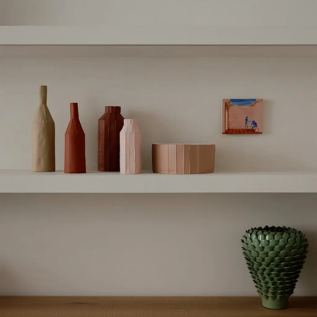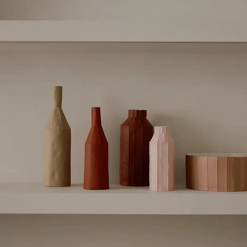 This stunning red brick vase is distinguished for its bold, irregular texture and unique silhouette obtained by the use of paper clay, an inventive material that combines fibers in the clay base giving the piece a strong aesthetic character. Every one of Paola Paronetto’s creations is unique. Slight variations in shape, colour and size are to be considered a guarantee of authenticity and value. They are finished with non-toxic satin-finish enamels. Although very rarely, it is possible for them to leak after long periods of exposure to water. It is therefore advisable to test their water resistance before using them on delicate surfaces. They should not be used as dining utensils. The white pieces can be washed with water or sanitizing products, whereas the coloured pieces must be treated more gently and cleaned with a feather duster or a soft cloth, dry or moistened very slightly with water. This piece is currently on show and immediately available at Artemest Galleria New York.