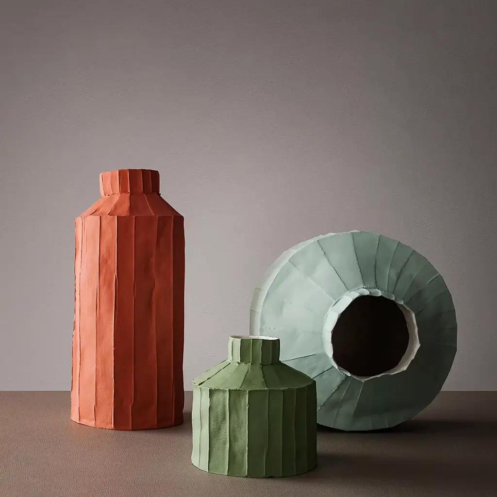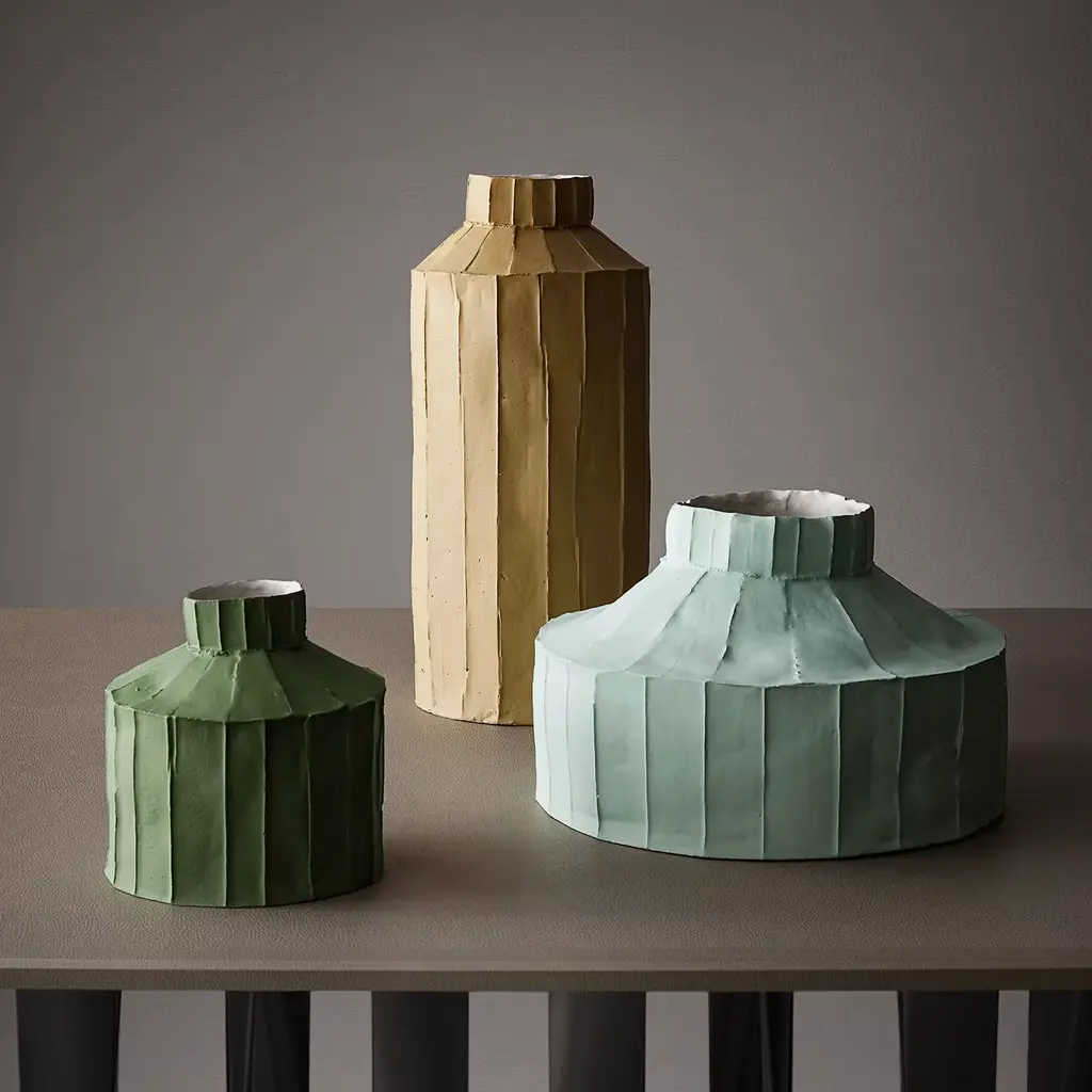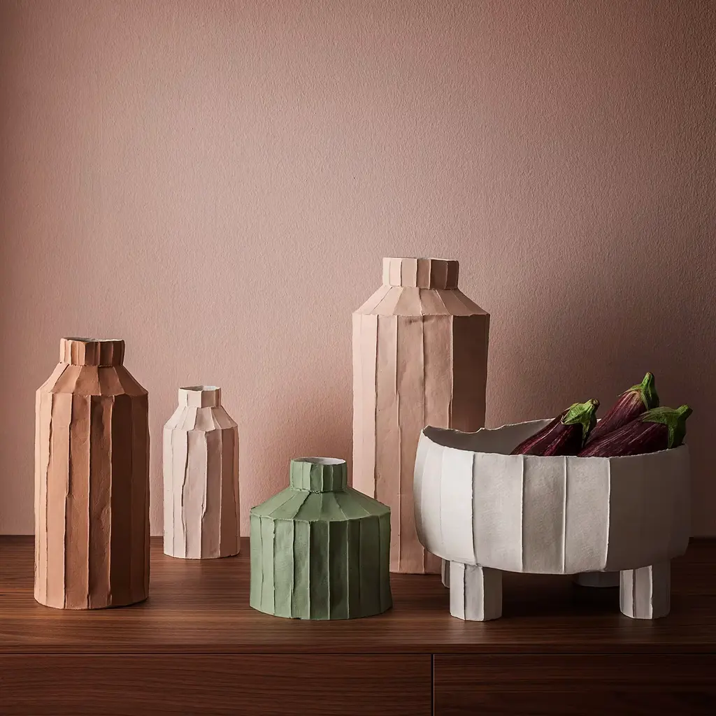 Sturdy but delicate with its irregular, vertical ridges, this striking vase is the result of a complex process of handmade craftsmanship that combines paper pulp, fibers, and clay to create a highly-textured material known as paper clay. Marked by a moss green color, this vase will be the perfect centerpiece to a table or console in a contemporary-styled decor. Every one of Paola Paronetto’s creations is unique. Slight variations in shape, colour and size are to be considered a guarantee of authenticity and value. They are finished with non-toxic satin-finish enamels. Although very rarely, it is possible for them to leak after long periods of exposure to water. It is therefore advisable to test their water resistance before using them on delicate surfaces. They should not be used as dining utensils. The white pieces can be washed with water or sanitizing products, whereas the coloured pieces must be treated more gently and cleaned with a feather duster or a soft cloth, dry or moistened very slightly with water.