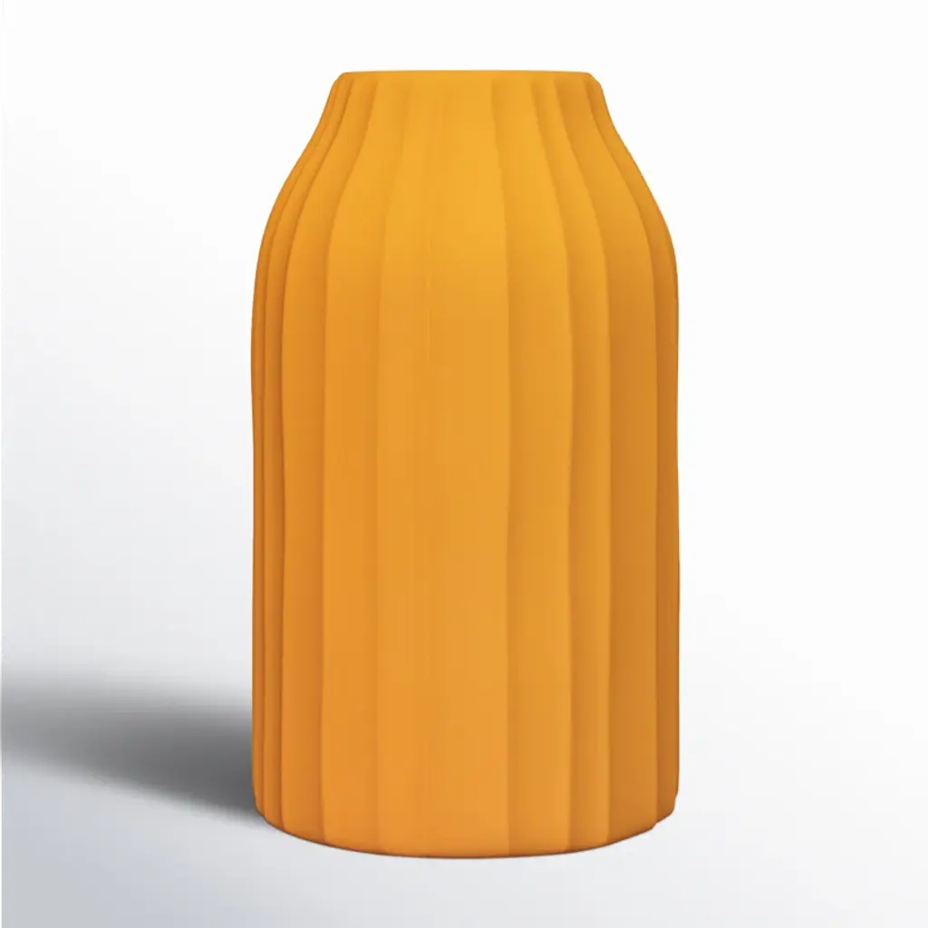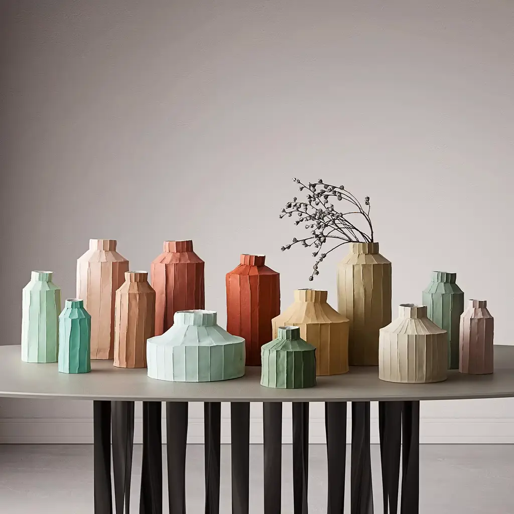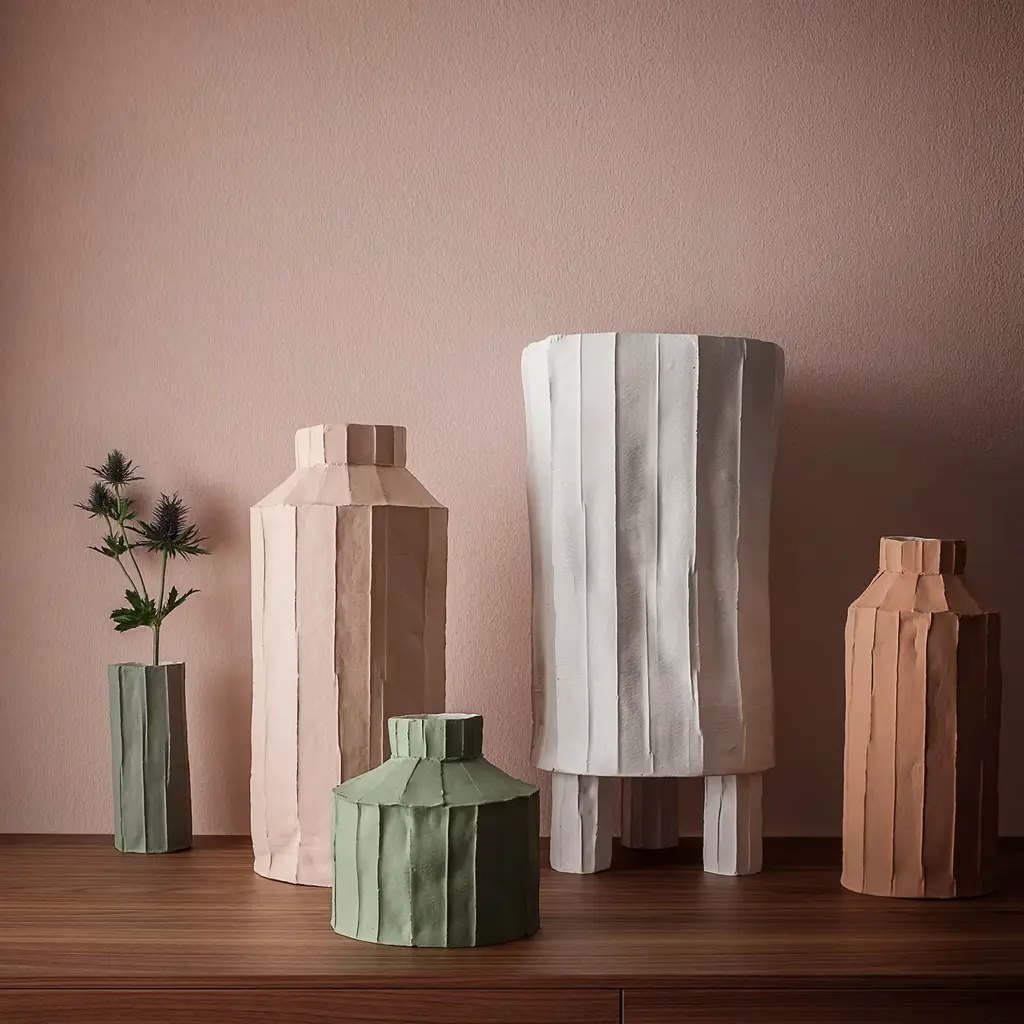 Sturdy but delicate with its irregular, vertical ridges, this striking vase is the result of a complex process of handmade craftsmanship that combines paper pulp, fibers, and clay to create a highly-textured material known as paper clay. Marked by a moss green color, this vase will be the perfect centerpiece to a table or console in a contemporary-styled decor. Every one of Paola Paronetto’s creations is unique. Slight variations in shape, colour and size are to be considered a guarantee of authenticity and value. They are finished with non-toxic satin-finish enamels. Although very rarely, it is possible for them to leak after long periods of exposure to water. It is therefore advisable to test their water resistance before using them on delicate surfaces. They should not be used as dining utensils. The white pieces can be washed with water or sanitizing products, whereas the coloured pieces must be treated more gently and cleaned with a feather duster or a soft cloth, dry or moistened very slightly with water.