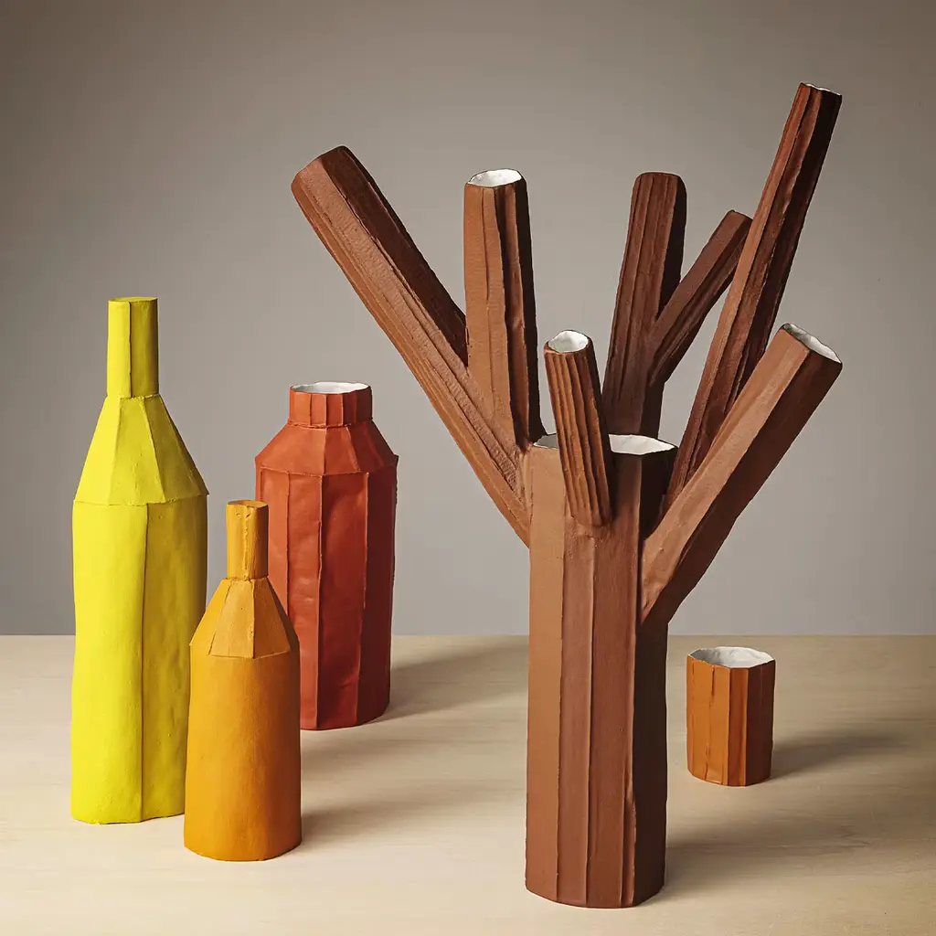 This striking vase will make an elegant centerpiece on a table or console in a modern home, infusing it with unique sophistication. Part of a series of contemporary pieces of functional decor, this object is exquisitely handcrafted of paper clay, a material that includes fibers in the clay base resulting in a dynamic and highly tactile final texture. Every one of Paola Paronetto’s creations is unique. Slight variations in shape, colour and size are to be considered a guarantee of authenticity and value. They are finished with non-toxic satin-finish enamels. Although very rarely, it is possible for them to leak after long periods of exposure to water. It is therefore advisable to test their water resistance before using them on delicate surfaces. They should not be used as dining utensils. The white pieces can be washed with water or sanitizing products, whereas the coloured pieces must be treated more gently and cleaned with a feather duster or a soft cloth, dry or moistened very slightly with water.