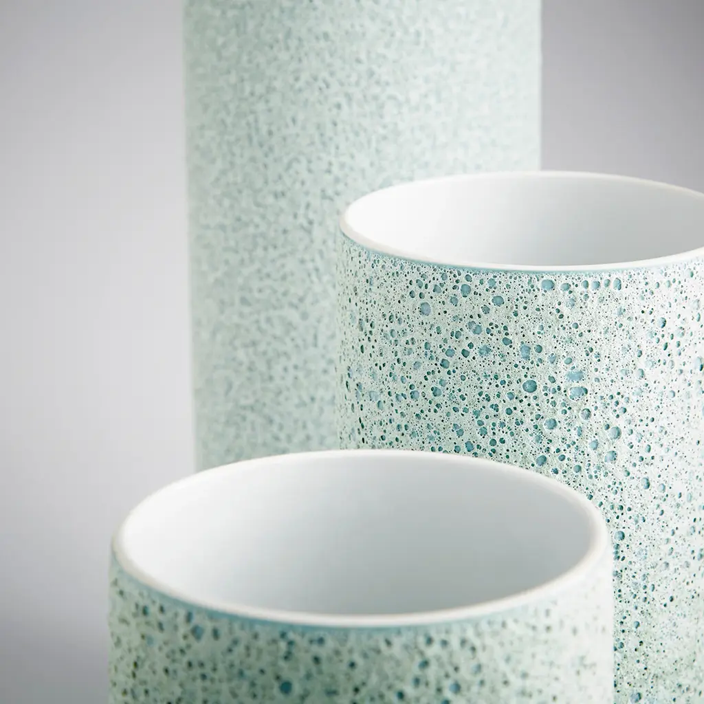 Add effortless style to your home with the colorful Fiji vase. Artisan crafted from porcelain material, this vessel features a striking green, textured surface pattern contrast with a subtle white glaze. Boasting grand scale, this tall, cylindrical body also features an open mouth for optimal storage capacity for your floral bouquets or bundled twigs. Perfect for transitional or contemporary styles, it makes a dynamic focal point in any setting.