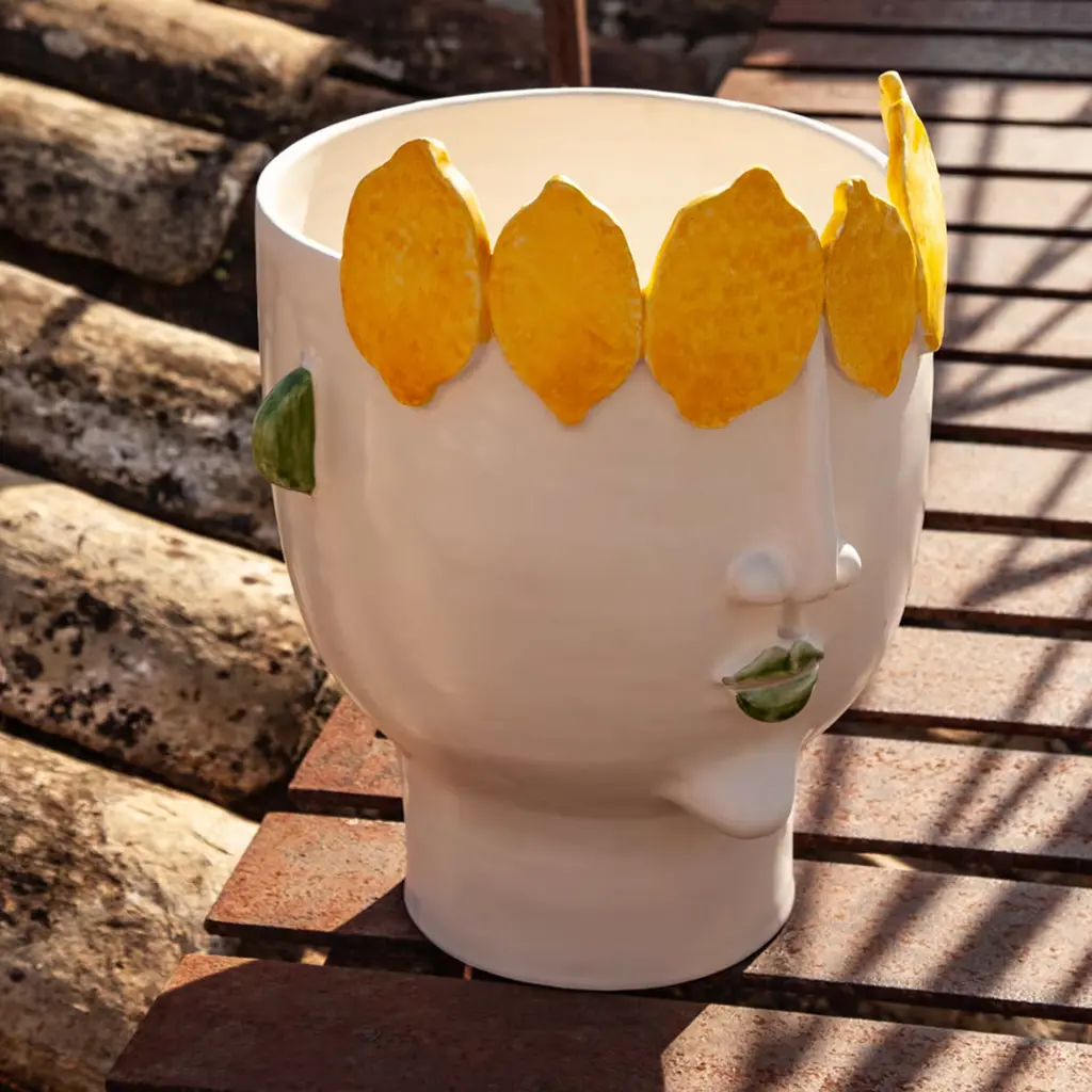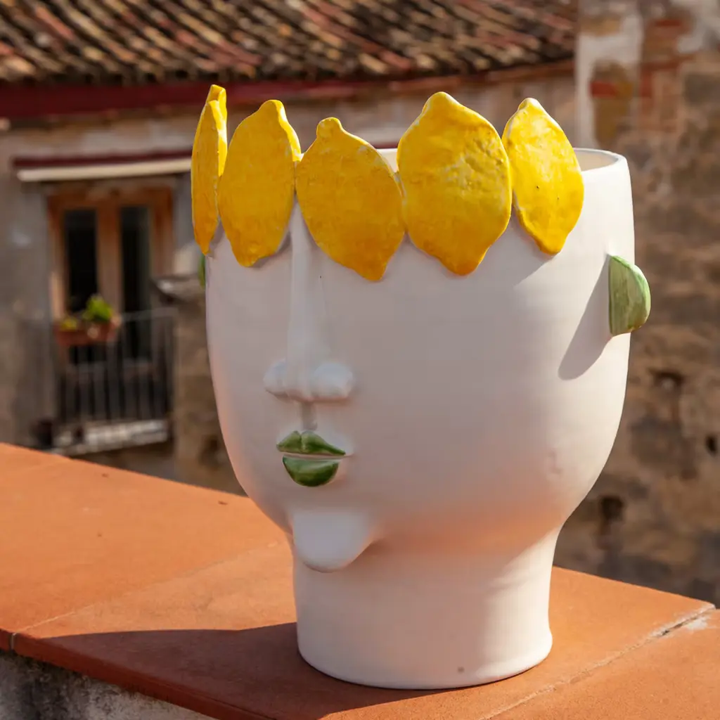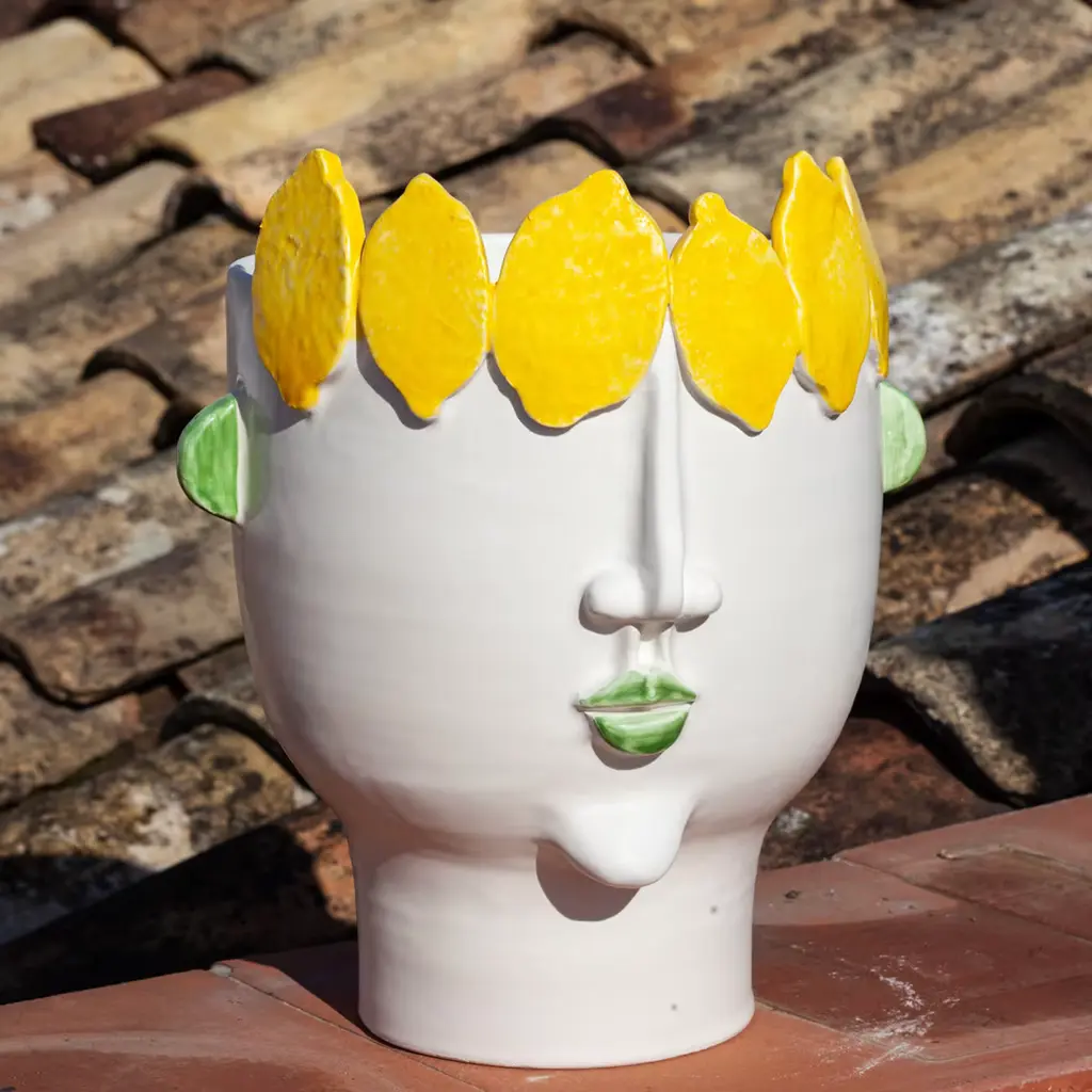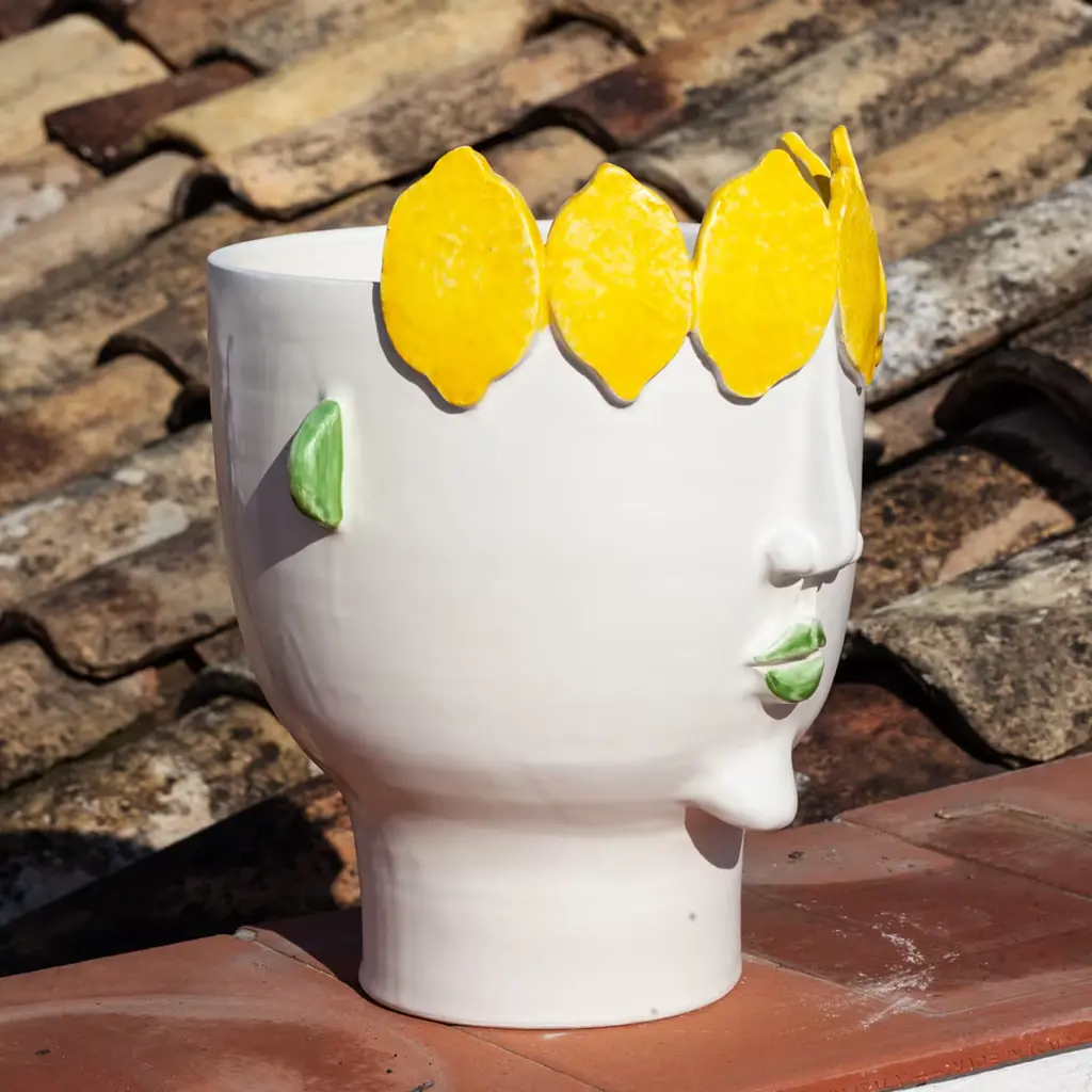 This entirely unique, head-shaped vase in matte white ceramic was handcrafted as an homage to the folk value of Sicilian street markets. Its anthropomorphic design was inspired by Filomena, a street vendor of lemons. Suitable for both indoor and outdoor use, her somatic traits are minutely rendered and accented in green, while a crown of yellow lemon shapes adorns the rim. The piece will splendidly host plants, flowers, or simply be displayed on its own.