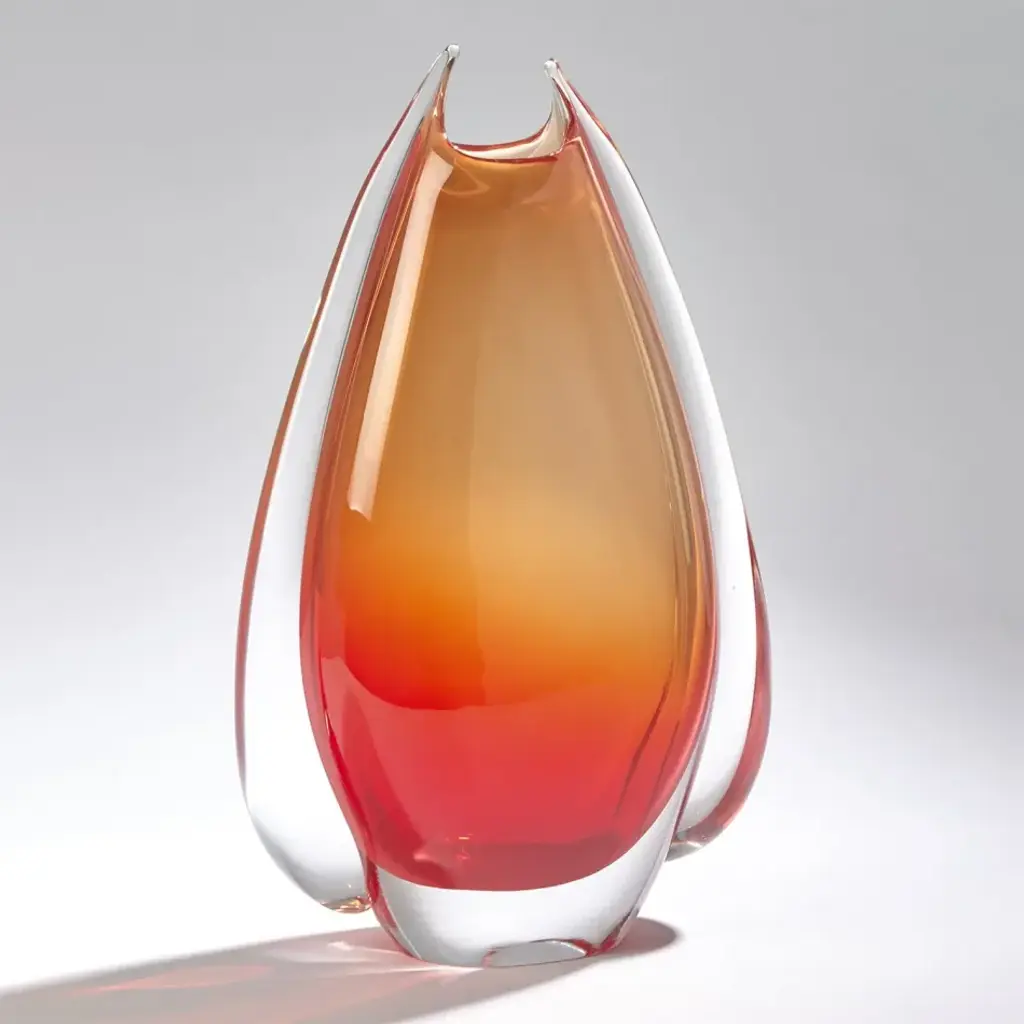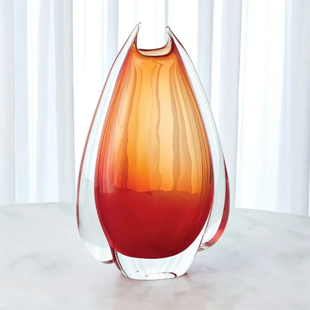 Our stunning Fin Vases are created by blowing colored-glass layers into a mold to produce red/orange glass. The clear glass fins are hand-cut while in a molten state and hand-applied by an artisan in a small art glass factory in the south-eastern point of Poland. Each piece is unique, so shape and color may vary. From a fashion forward perspective, Global Views offers accessories, furniture, statement lighting, and an assortment of rugs and mirrors to add beauty and joy to your home.