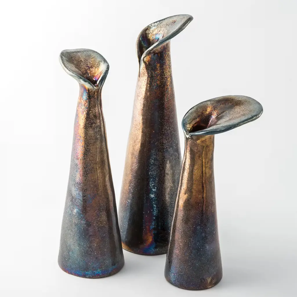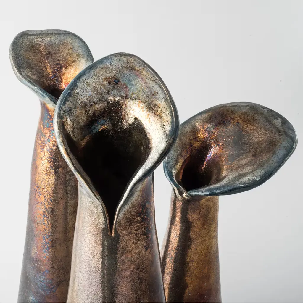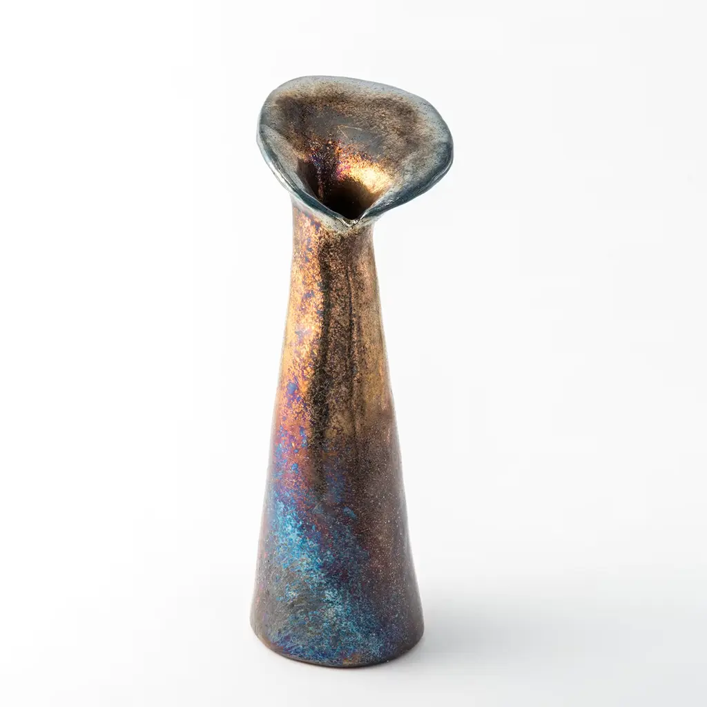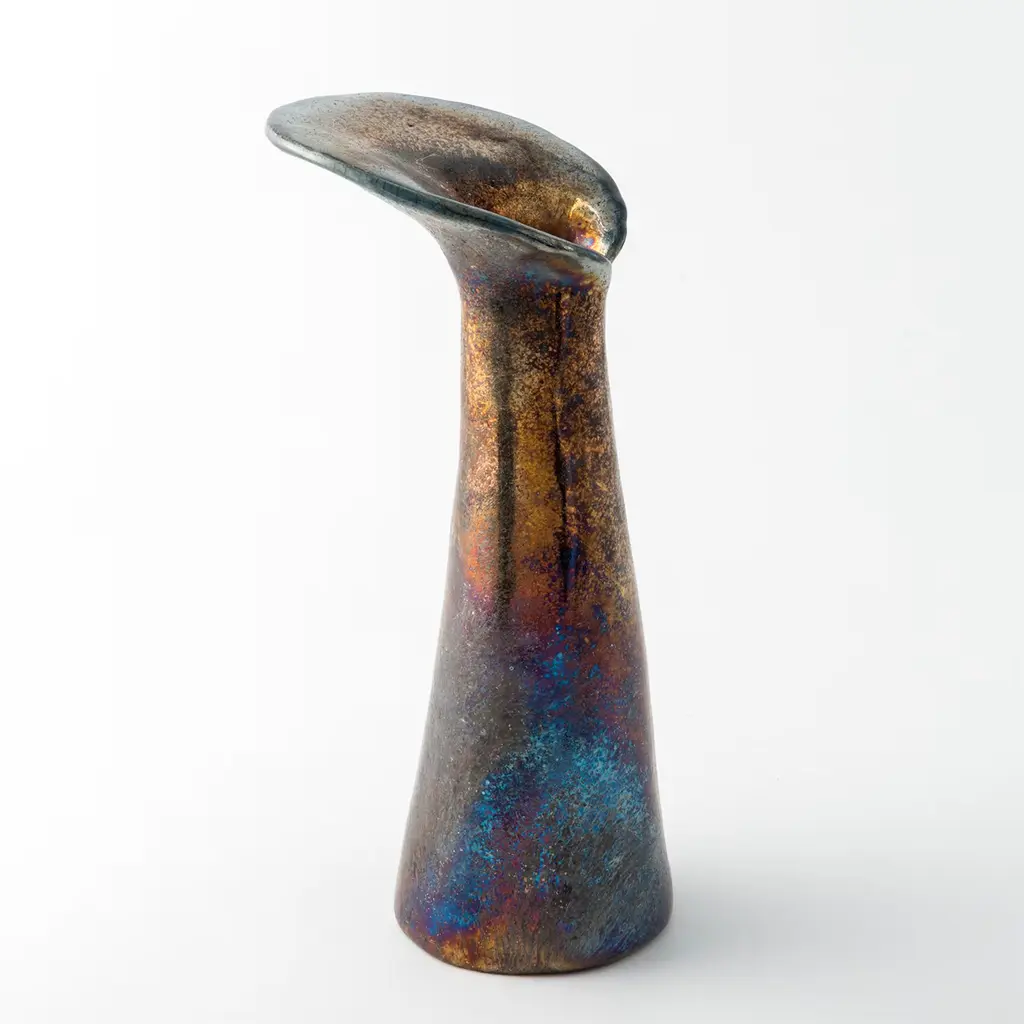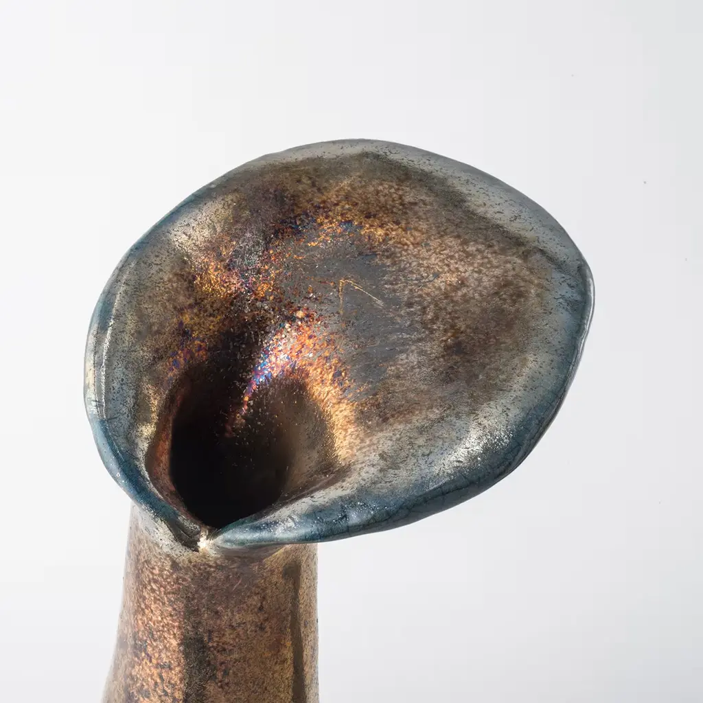 A conical silhouette unexpectedly culminating in a calla-shaped mouth immediately reveals the romantic allure of this sculptural vase. Deftly molded and decorated by hand by artist Nino Basso, the piece boasts coppery-bronze shades together with cobalt-blue accents enhanced by a slight and elegant unrefined texture. Poetically named after the Italian for 'nocturnal flower", each piece is unique and delivered with its authenticity certificate.