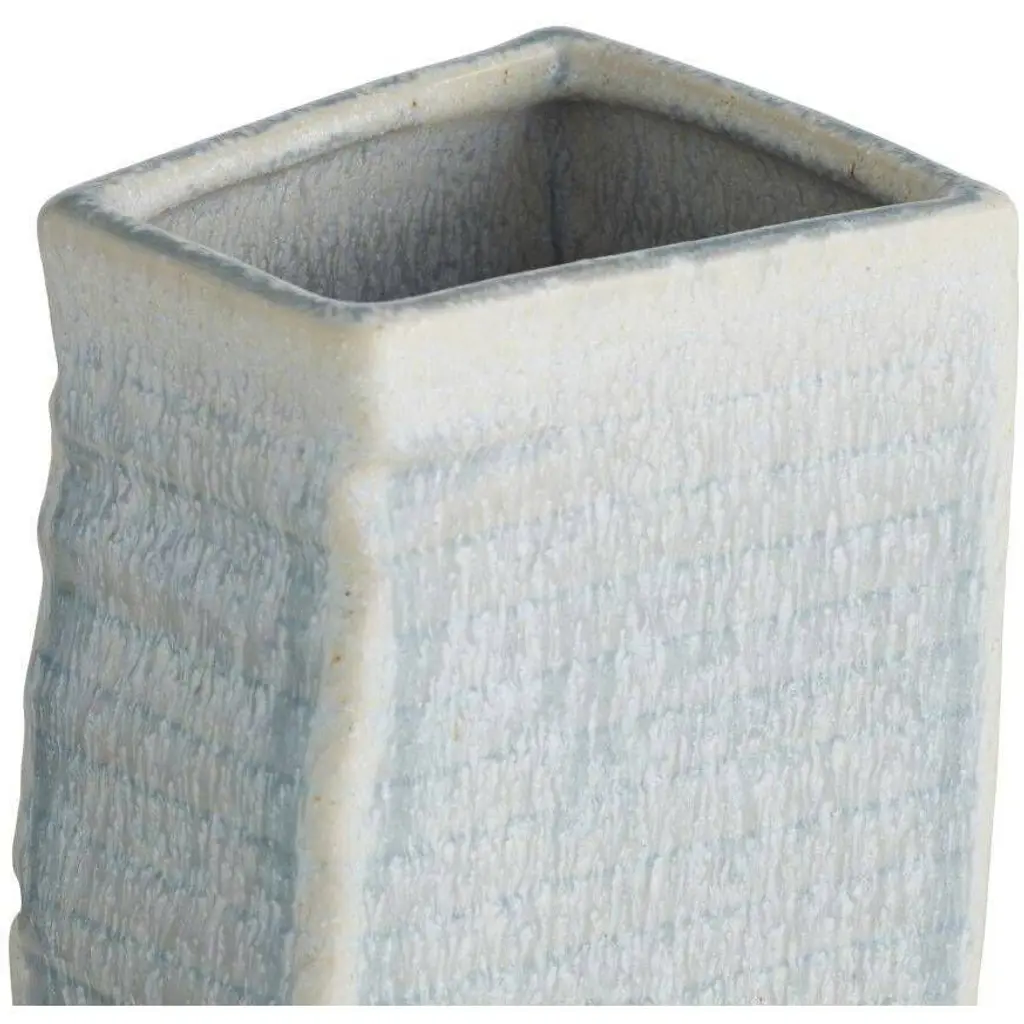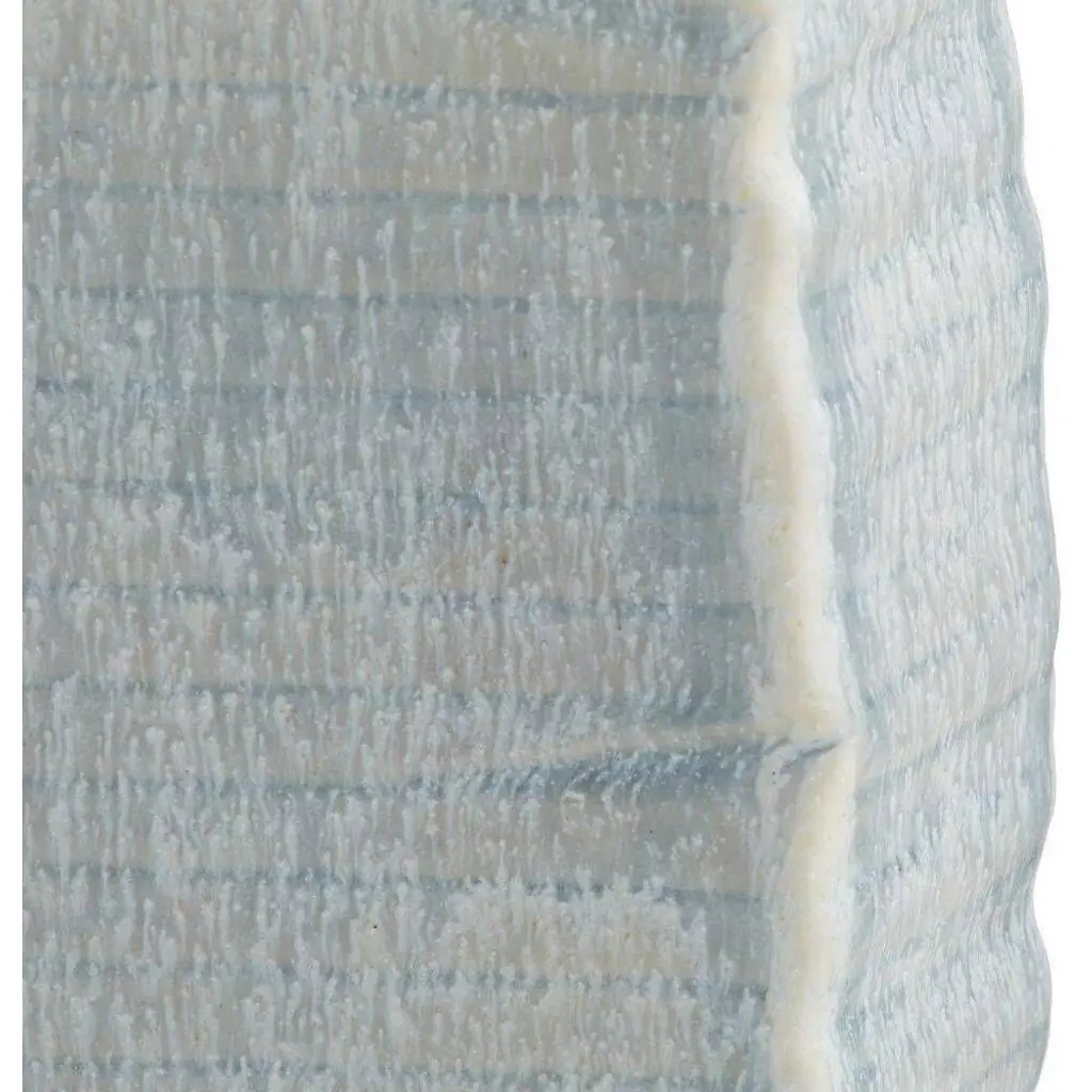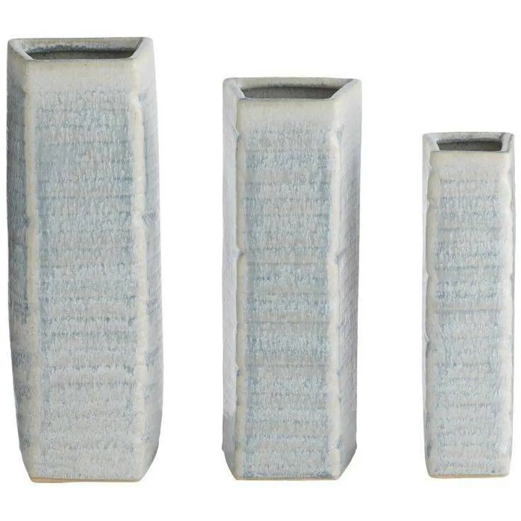 Abstract botanical elements lend a textural finish to a trio of ceramic vases. With a texture reminiscent of palm fronds, each is hand-cast, then glazed in an icy morn shade with subtle gradations of color. Finish will vary.