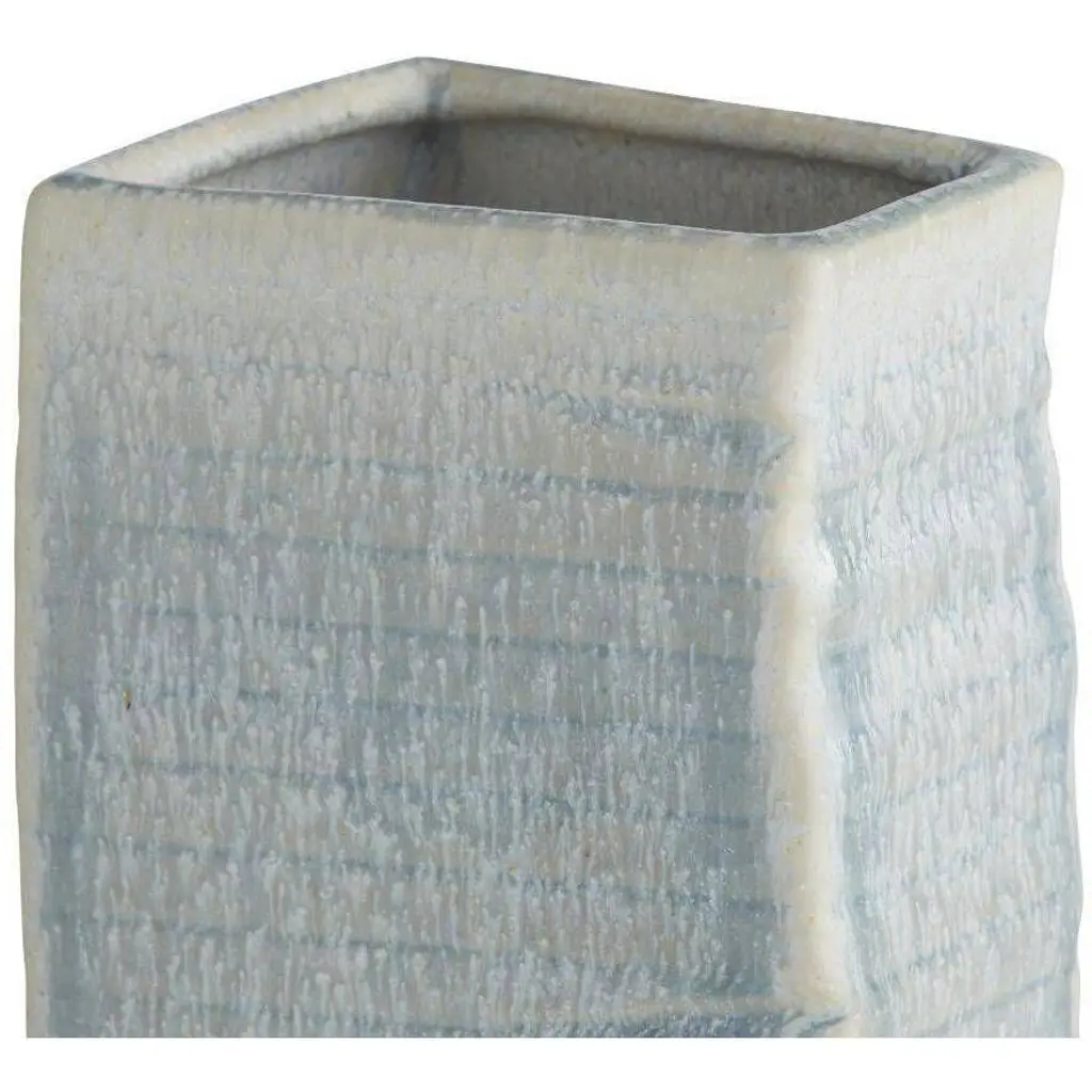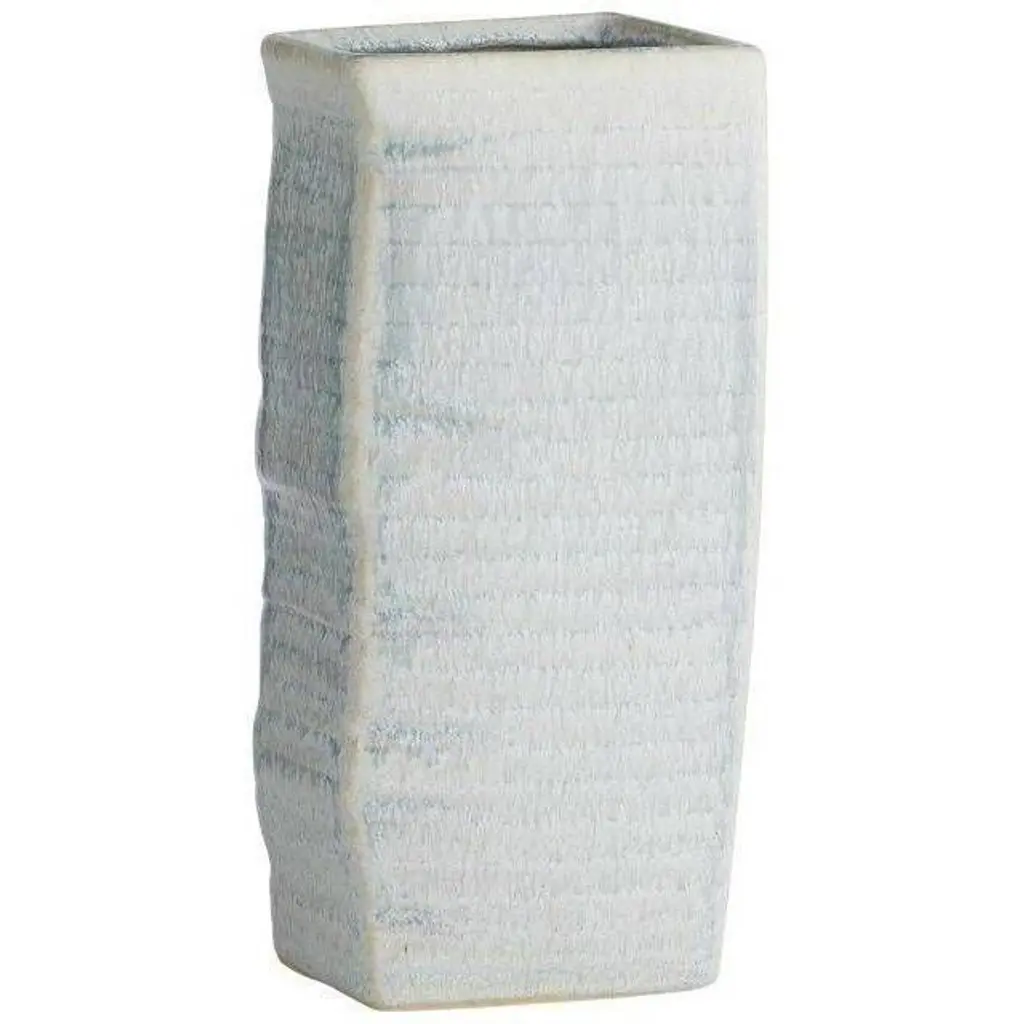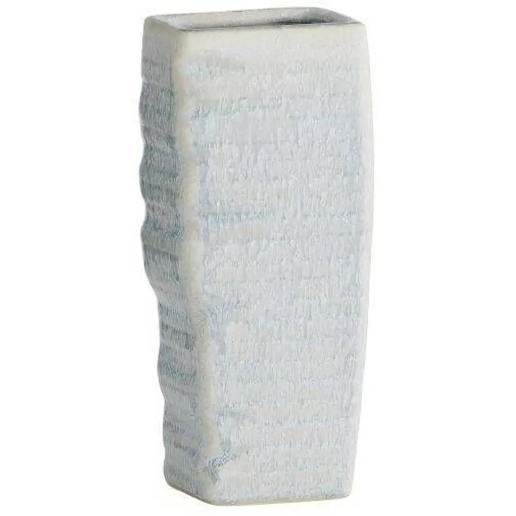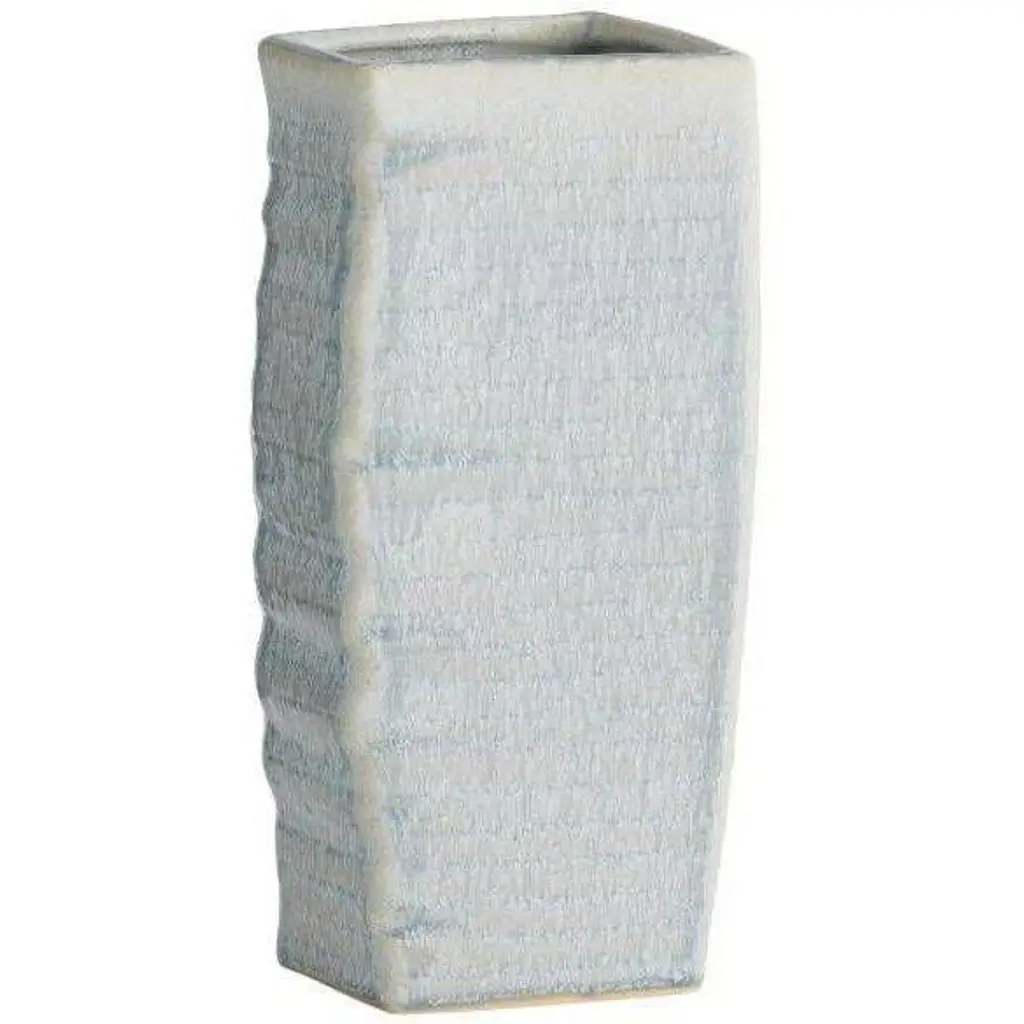 Abstract botanical elements lend a textural finish to a trio of ceramic vases. With a texture reminiscent of palm fronds, each is hand-cast, then glazed in an icy morn shade with subtle gradations of color. Finish will vary.