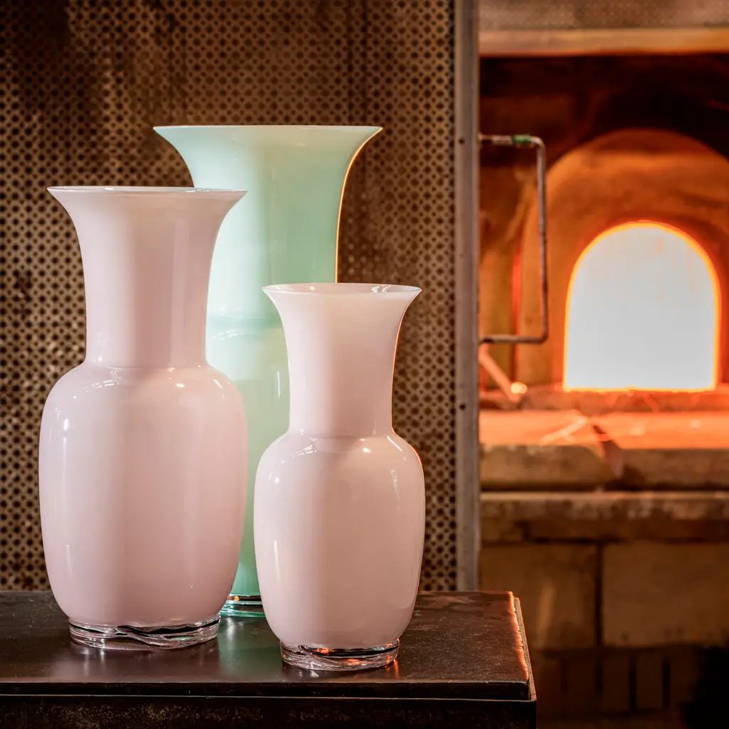 Elegance has no excess, no frills, no illusions. Elegance is purity, it is essential and perfect lines. Refined colors capable of getting noticed for their delicacy. Elegance is a hand-blown glass vase that never reveals its age and that for over eighty years has been present in exhibitions and publications all over the world. Elegance has a synonym and it is Opalino.