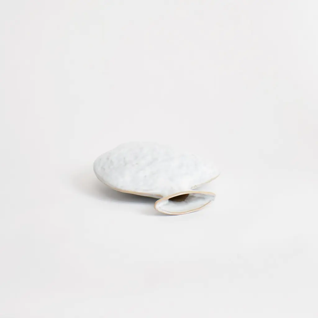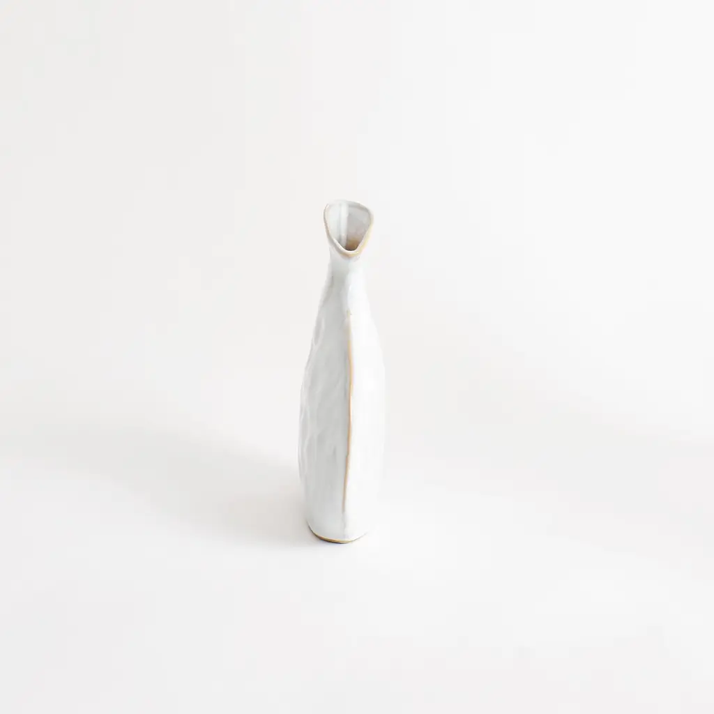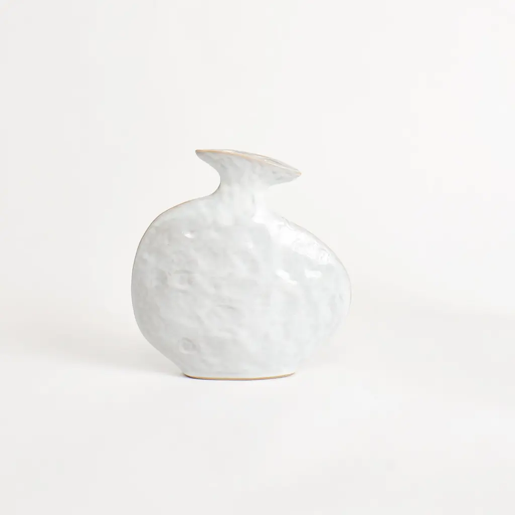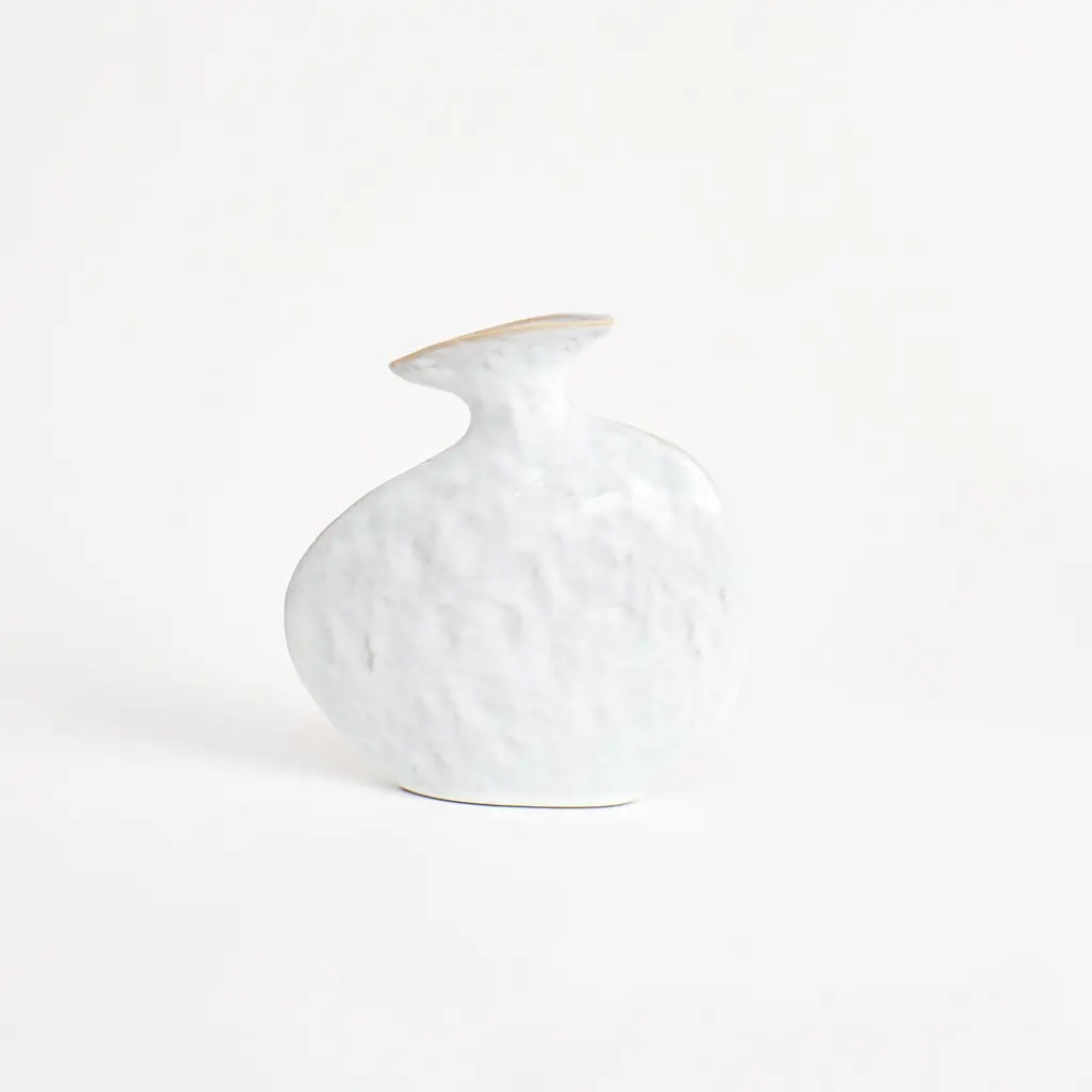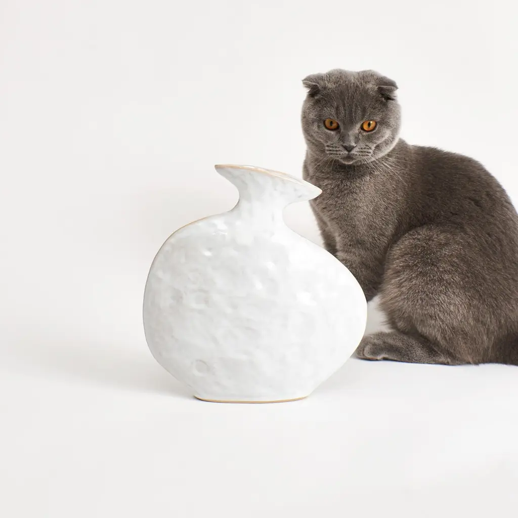 Flat vase in Shiny White.Designed by Project 213A in 2021.Handmade Stoneware.Creation demands destruction, taking the old and the typical to conceive the new and particular. The Flat Vase represents the essence of this idiosyncrasy through its accidental creation. Formerly a typical round vase, once dropped a new concept was discovered.This playful vase was designed after a happy accident in the workshop while sculpting what was supposed to be a very round vase that fell off the table and flattened. The vase has a hammered finish with a contemporary shiny glaze and is hallmarked with a discreet P 213 A embossed logo.This Vase has a beautiful white glaze that appears translucent in some places revealing the colour of the clay. Each piece is unique due to the way the glaze develops during the firing process.Color : Shiny whiteHeight : 23cmWidth : 22cmDepth : 5cm.