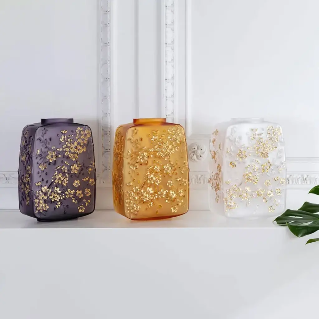 The world-famous and wondrous blossoming of Japanese cherry trees inspired the design of this masterpiece of interior decoration. Illuminated with gold and highlighted with enamel, applied by hand, cherry blossoms symbolize the ephemeral character of beauty and life, inviting one to marvel at the present moment. In a numbered edition in clear or (Ltd Edition 88 Pcs) (lucky number in Asia) for the amber version, this vase captures the ornamental power of this iconic flower. Trained as a jeweler at the Ecole des Arts Decoratifs in Paris in the late 1880's, Rene Lalique gained recognition as an independent designer for some of the era's great jewelry houses including Cartier and Boucheron. Eventually, he turned to glassmaking, and his techniques were a triumph for the Art Deco movement. Every piece of Lalique is finely detailed and produced by hand in Alsace, France.