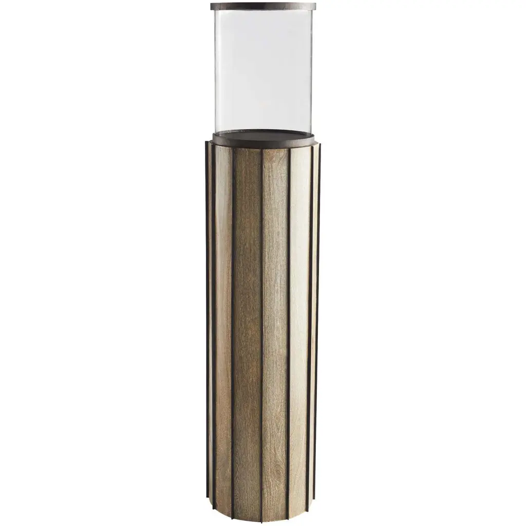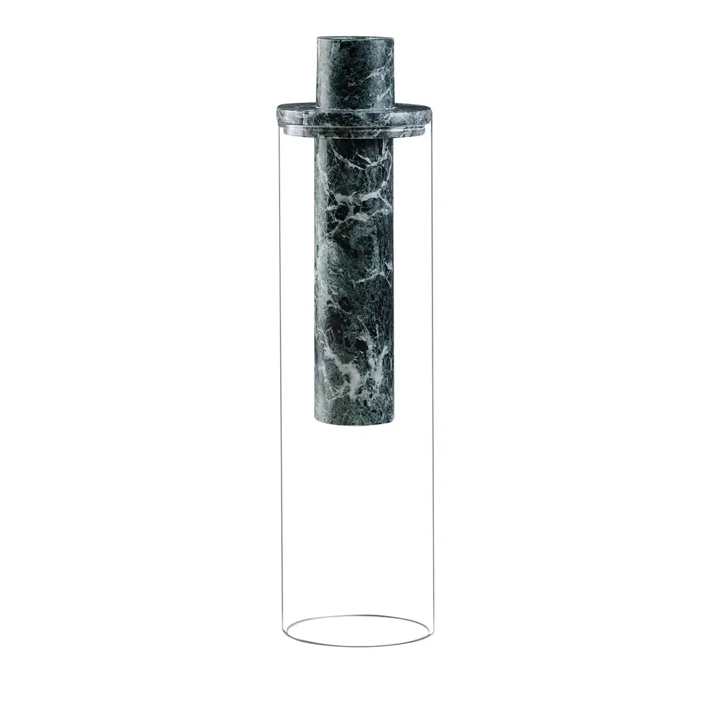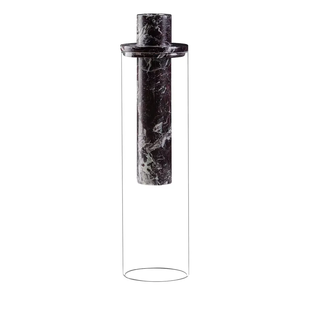 Geometric flair and natural traceries lend this vase its unmistakably contemporary charm. Set in a clear glass cylinder that reveals all of its veins, the vase results seemingly floating in mid-air, an effect cleverly achieved by combining fine materials with opposite characteristics. Rosso Levanto and Limestone Sinai variants are also available in the Artemest catalog.