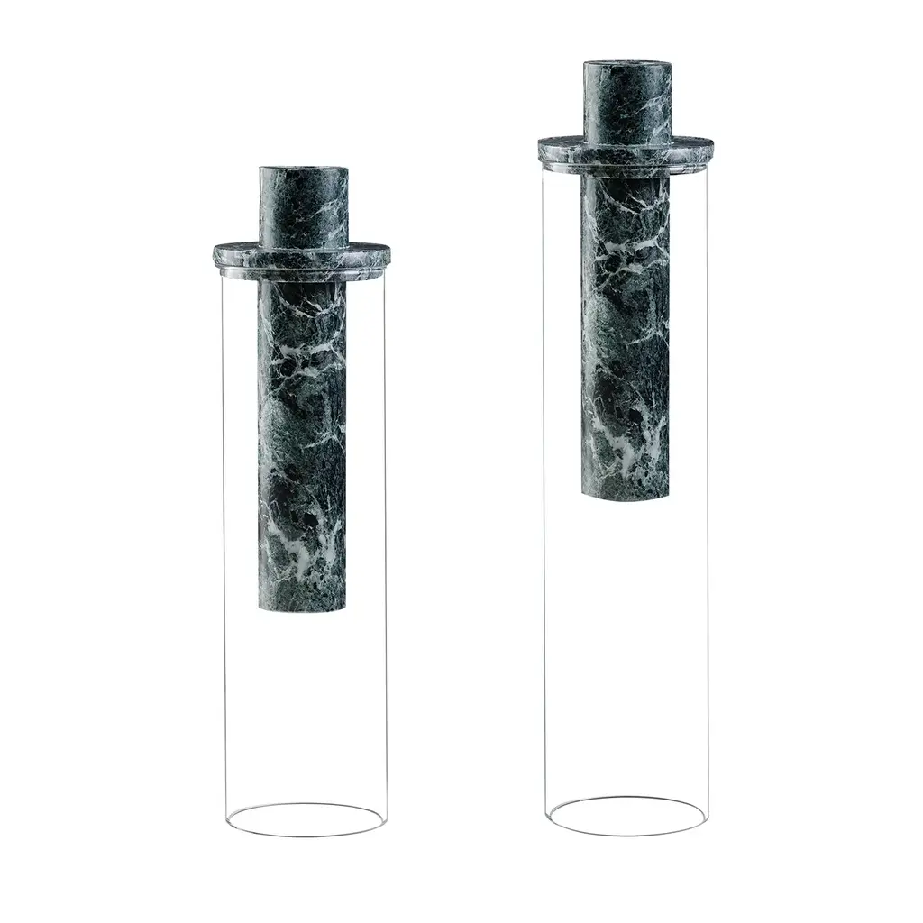 Brimming with sculptural allure, this superb vase combines glass and marble in an interplay of transparencies that lends it a captivating visual effect. The shaped Verde Alpi marble element, set in the clear glass cylinder, appears as seemingly fluctuating, a juxtaposition of materials that underlines their weight contrast. Rosso Levanto and Limestone Sinai variants are available.