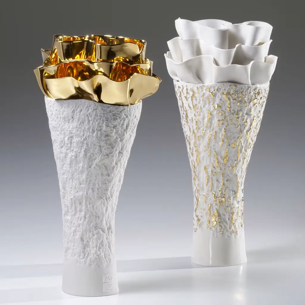 Introduced at Milan Design Week 2019, this vase is a celebration of nature. This one-of-a-kind, the luxurious object is crafted of porcelain with a flared bottom boasting a striking texture, while the top is a magnificent display of craftsmanship in the smooth waves of porcelain that wraps around one another in delicate movements, coated in 23k gold for a luminous effect.