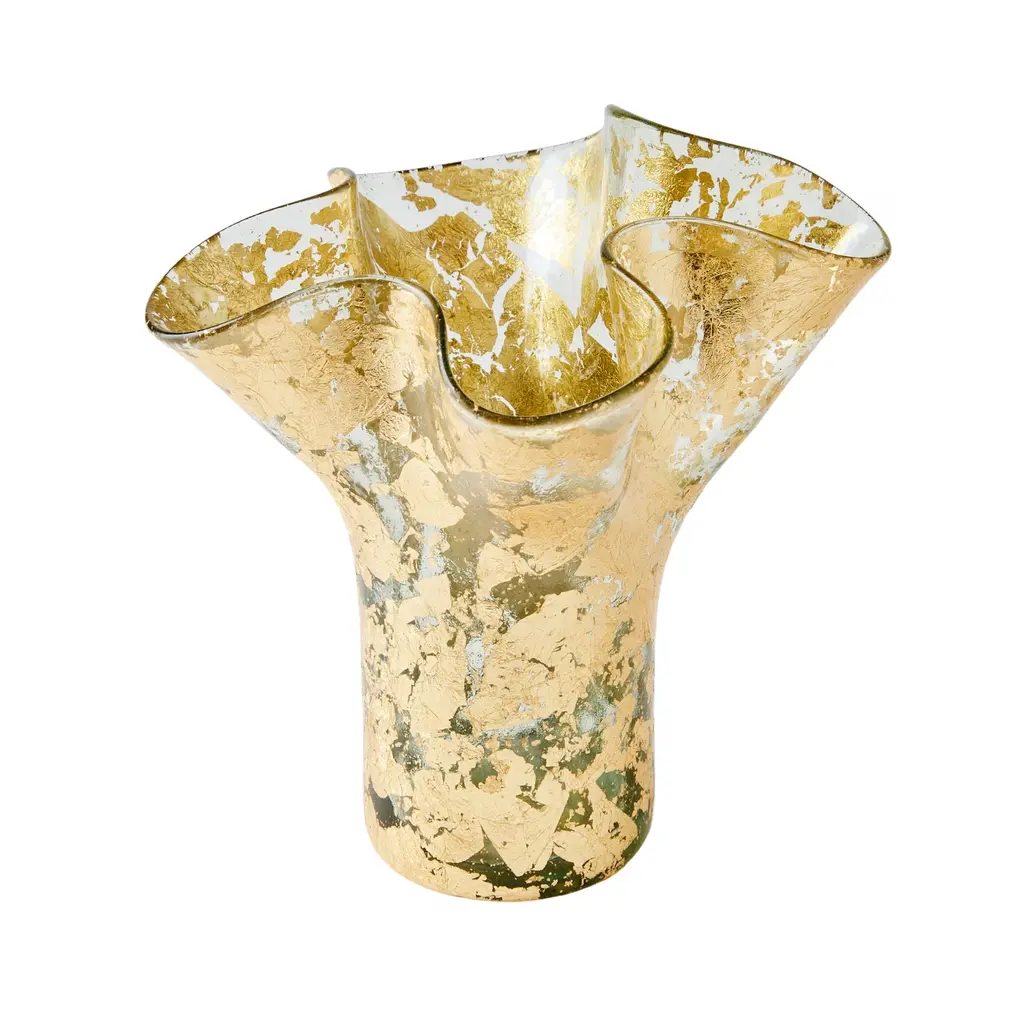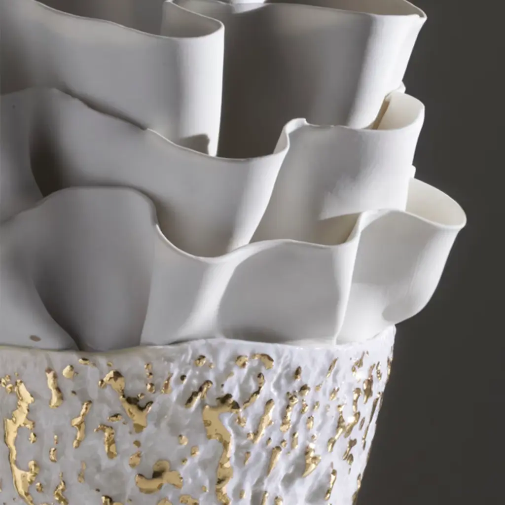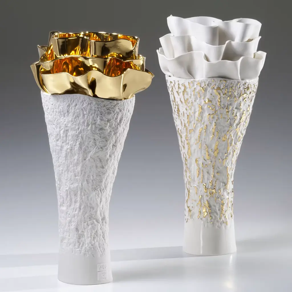 This elegant vase was introduced at Milan Design Week 2019 and honors nature's striking forms and textures in a luxurious and enchanting piece. The delicate waves that enliven the top of the piece are gathered together in the flared bowl that features a stunningly irregular surface, highlighted by 23k gold that accentuates the organic allure of this piece.