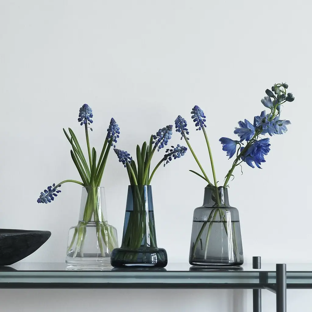 This smoke-coloured Flora vase in hand-blown glass. Award-winning designer Louise Campbell created the vase based on the idea that fresh flowers need plenty of water. The spacious bottom matches the slender mouth, ideal for a long-stemmed flower.