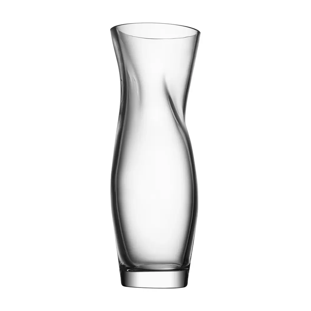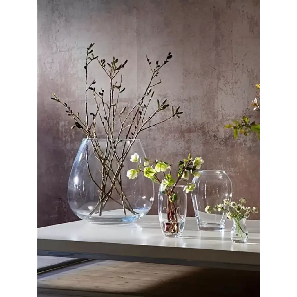 A mouth-blown glass vase with thick walls which curve at the top to narrow the opening. Designed for leafy foliage or wildflowers from the garden. Mouth-blown glass Curved shape Thick walls