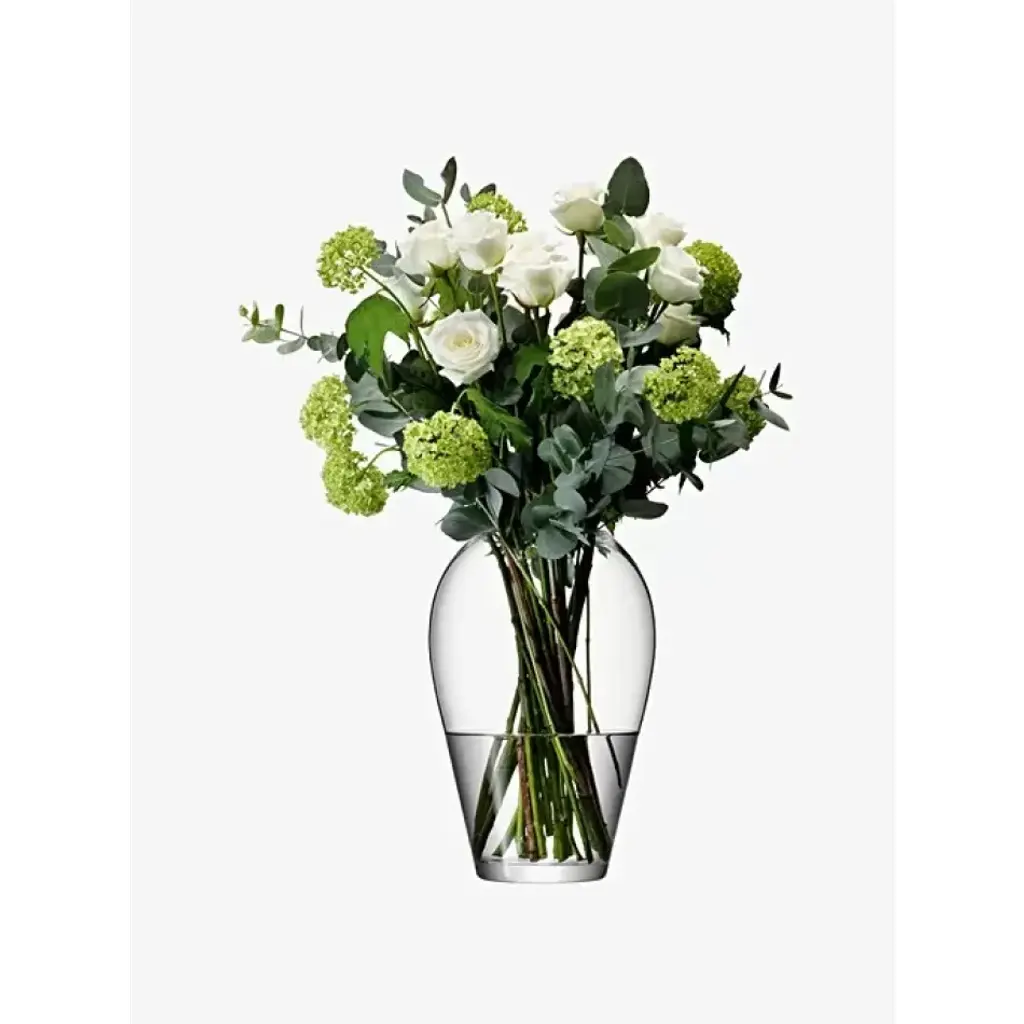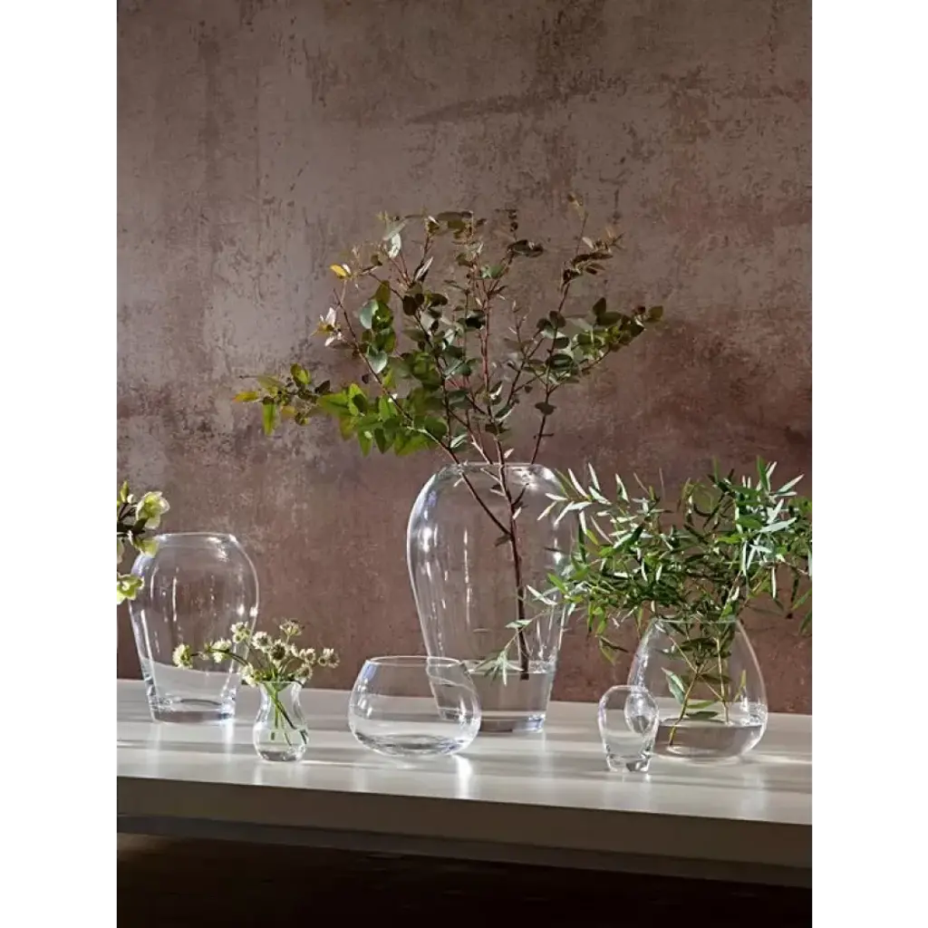 A mouth-blown glass vase with thick walls which curve at the top to narrow the opening. Designed for tall stems of flowers or foliage. Mouth-blown glass Curved shape Thick walls