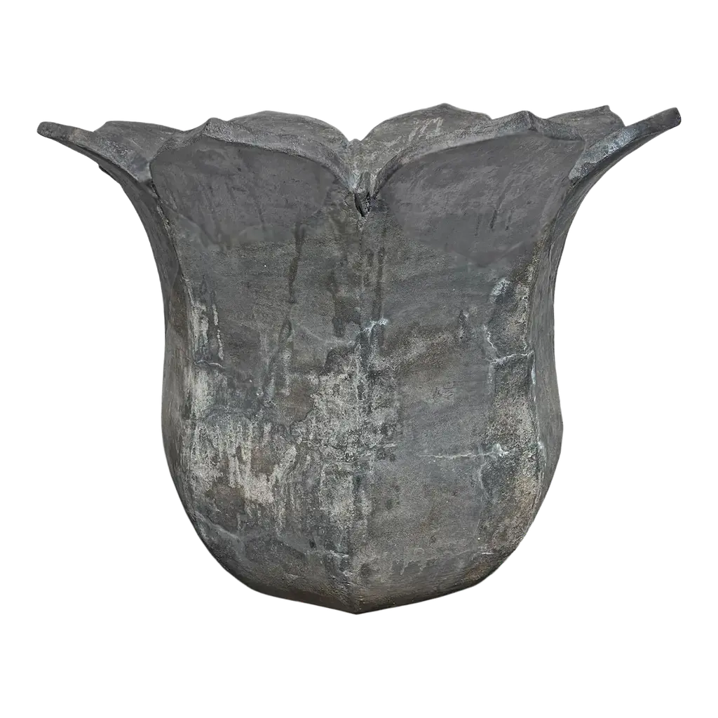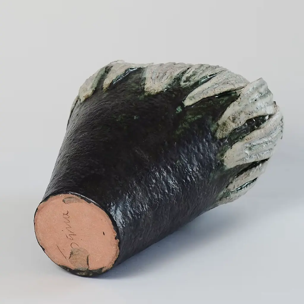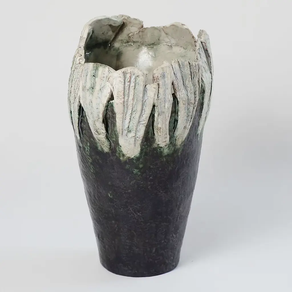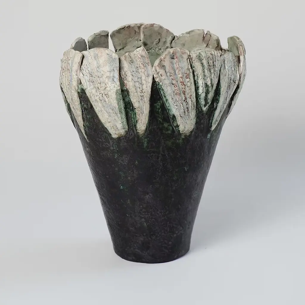 This striking oval vase resembling a blooming flower, was hand made in terracotta using the coiling technique and covered in rich glazes and oxides. Due to its hand-crafted nature, reproductions of this piece will be similar but not identical.