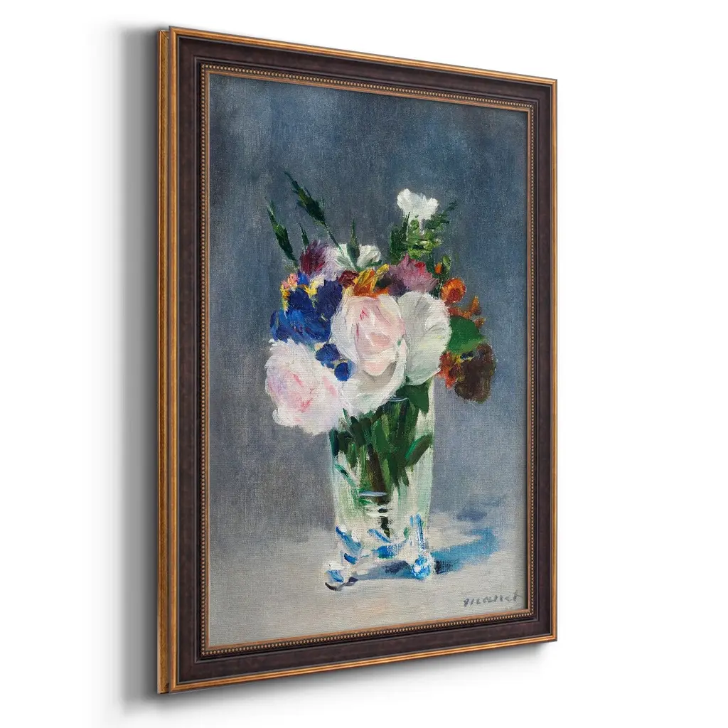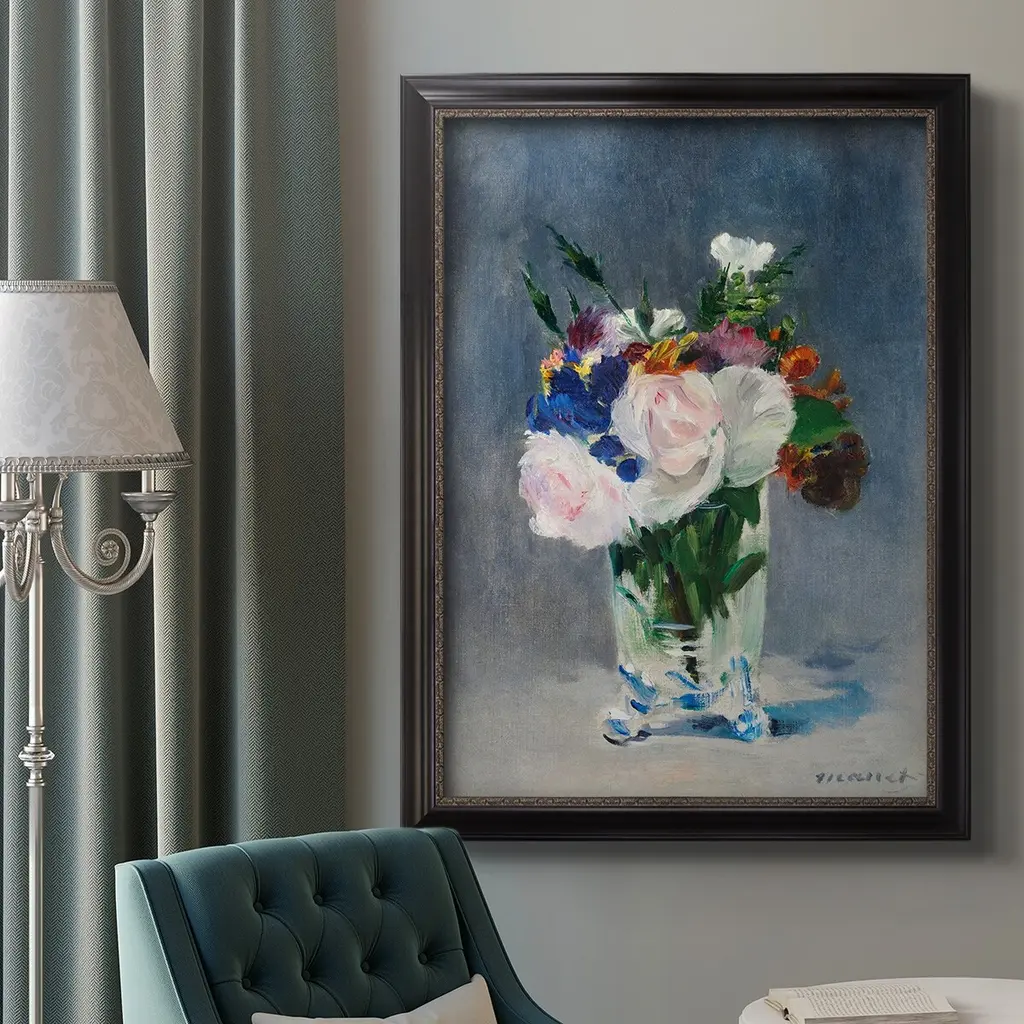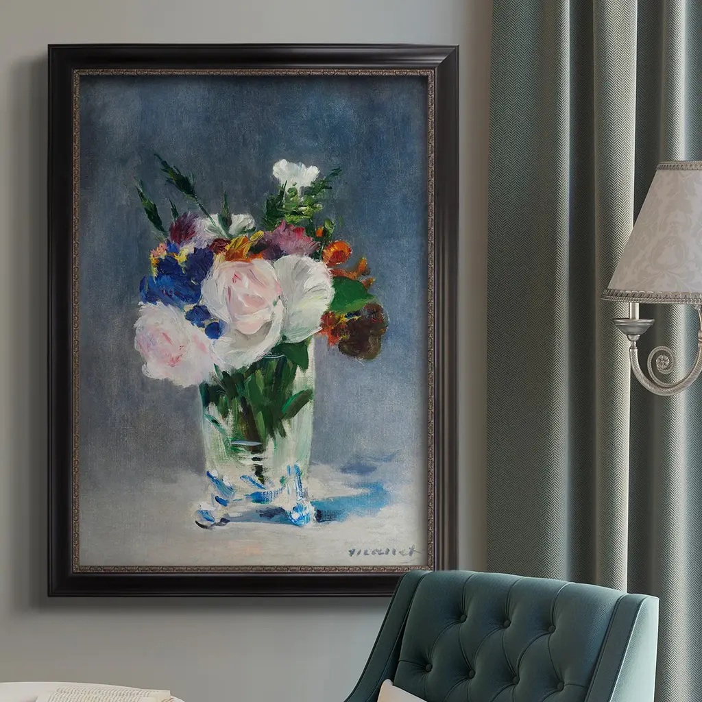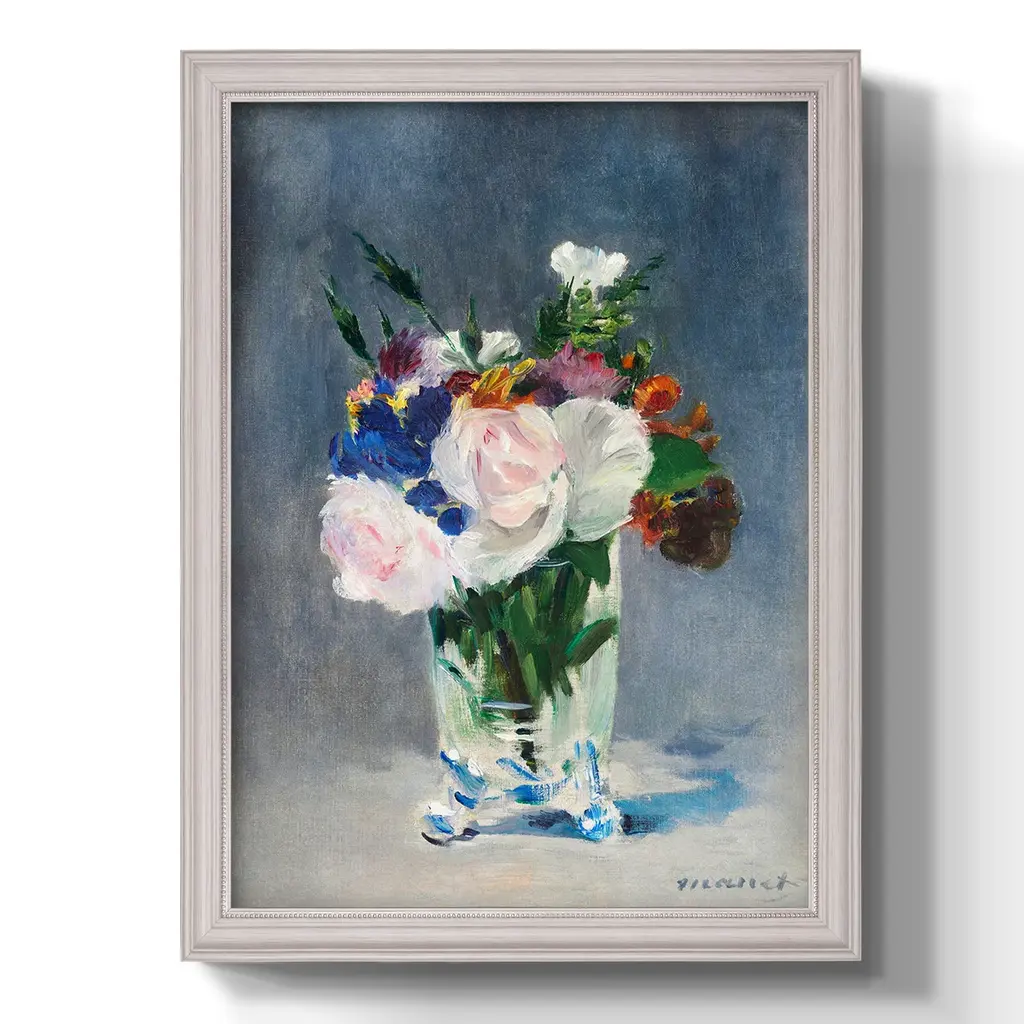 Flowers in a Crystal Vase Premium Framed Canvas- Ready to Hang A Premium Framed Canvas created to last. Framed in distressed wood and available in an array of sizes and colors Featuring a beveled a solid wood stretcher bar, each piece comes ready to hand 3 SIZES AVAILABLE 16''X20'' - Overall Size 18'X27'' - Overall Size 24''x36'' - Overall Size Each piece is made to order. Each piece comes with hanging hardware. Made in the USA Ready to Hang Giclee Paper Print Acrylic Glass Beveled Matt Board