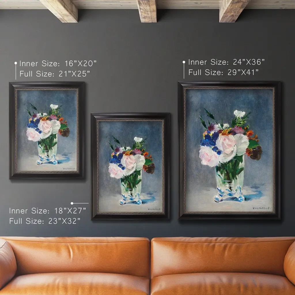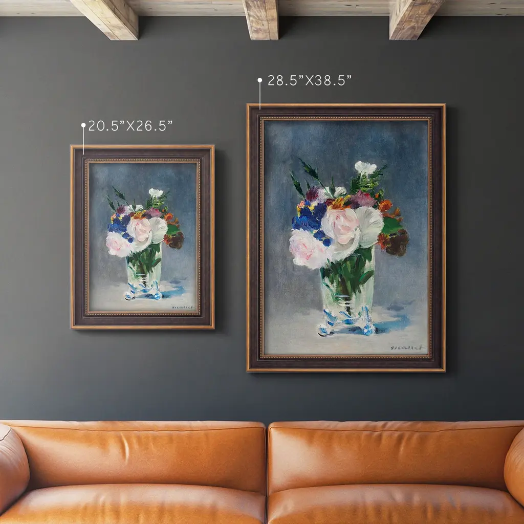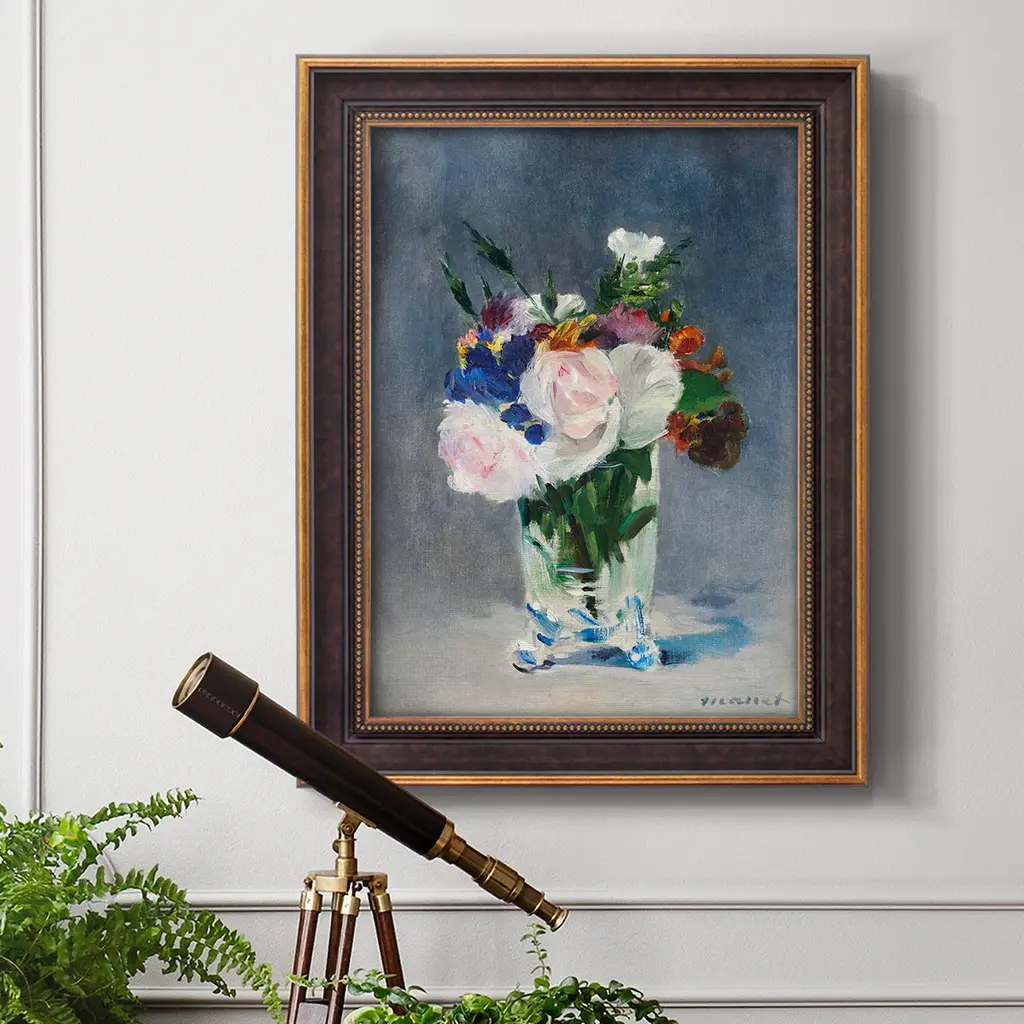 Flowers in a Crystal Vase Premium Framed Canvas- Ready to Hang A Premium Framed Canvas created to last. Framed in distressed wood and available in an array of sizes and colors Featuring a beveled a solid wood stretcher bar, each piece comes ready to hand 3 SIZES AVAILABLE 16''X20'' - Overall Size 18'X27'' - Overall Size 24''x36'' - Overall Size Each piece is made to order. Each piece comes with hanging hardware. Made in the USA Ready to Hang Giclee Paper Print Acrylic Glass Beveled Matt Board