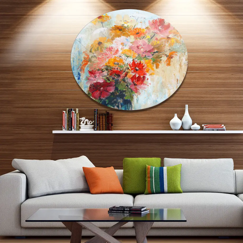 Bring Contemporary Abstraction to your home with this large Circle Metal wall art. This Flowers in Vase Painted Illustration Metal Artwork makes it the focal point of any room or office. - White Gloss Coating ensures colors are extra vibrant with light reflection.- Aluminum grade Sheet Metal with 1 inch mounting frame on the back giving the illusion that the artwork is floating on the wall..- Mounting Brackets are included along with instructions.- High Quality Digital images are created directly into a glossy aluminum panel producing a stunning and captivating print into the glossy finish of the metal.- Water, Fire and Scratch resistant HD Aluminum panels.- Looks better than any photo paper and guaranteed to last at least 20 years- Easy to clean with a microfiber cloth. Colors are far superior to regular Canvas Art. - Easy to Hang