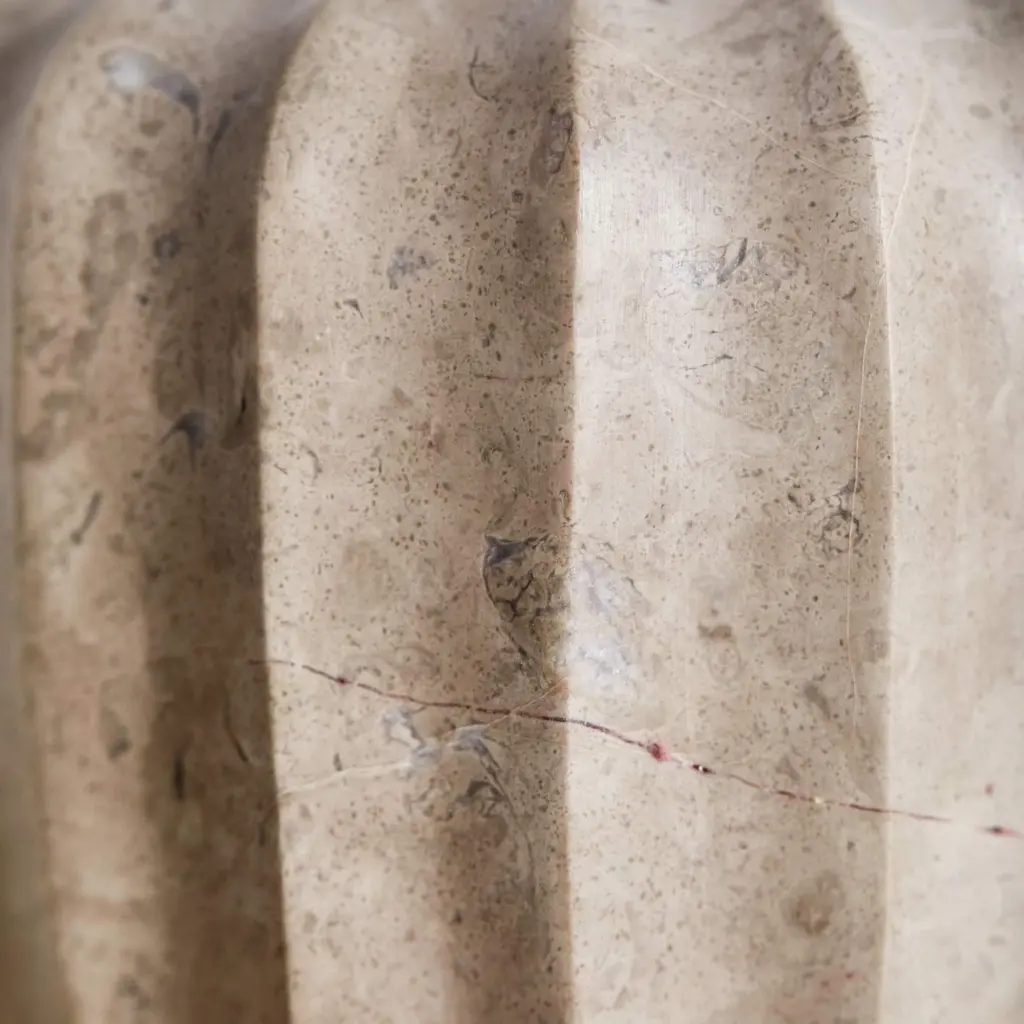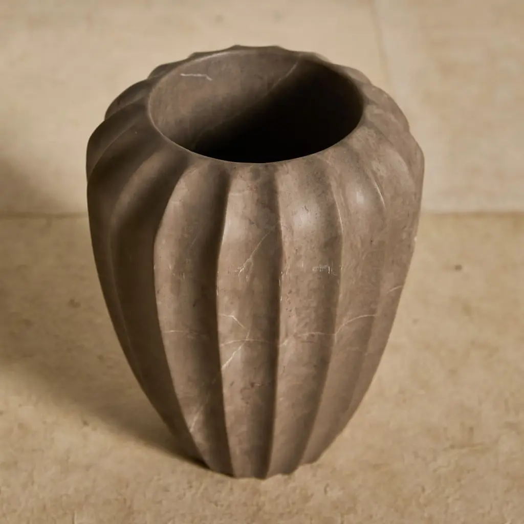 This sculptural vase is hand-carved from solid marble, the elegant fluting lending it a classical and timeless silhouette. Designed to hold a simple floral arrangement or to be displayed on their own, both sizes, standard and large, are available in a variety of marble colors including Nero Marquina, Blanco Macael, and Rossa Francia. Marble is a natural material so variations in markings and coloration will occur.