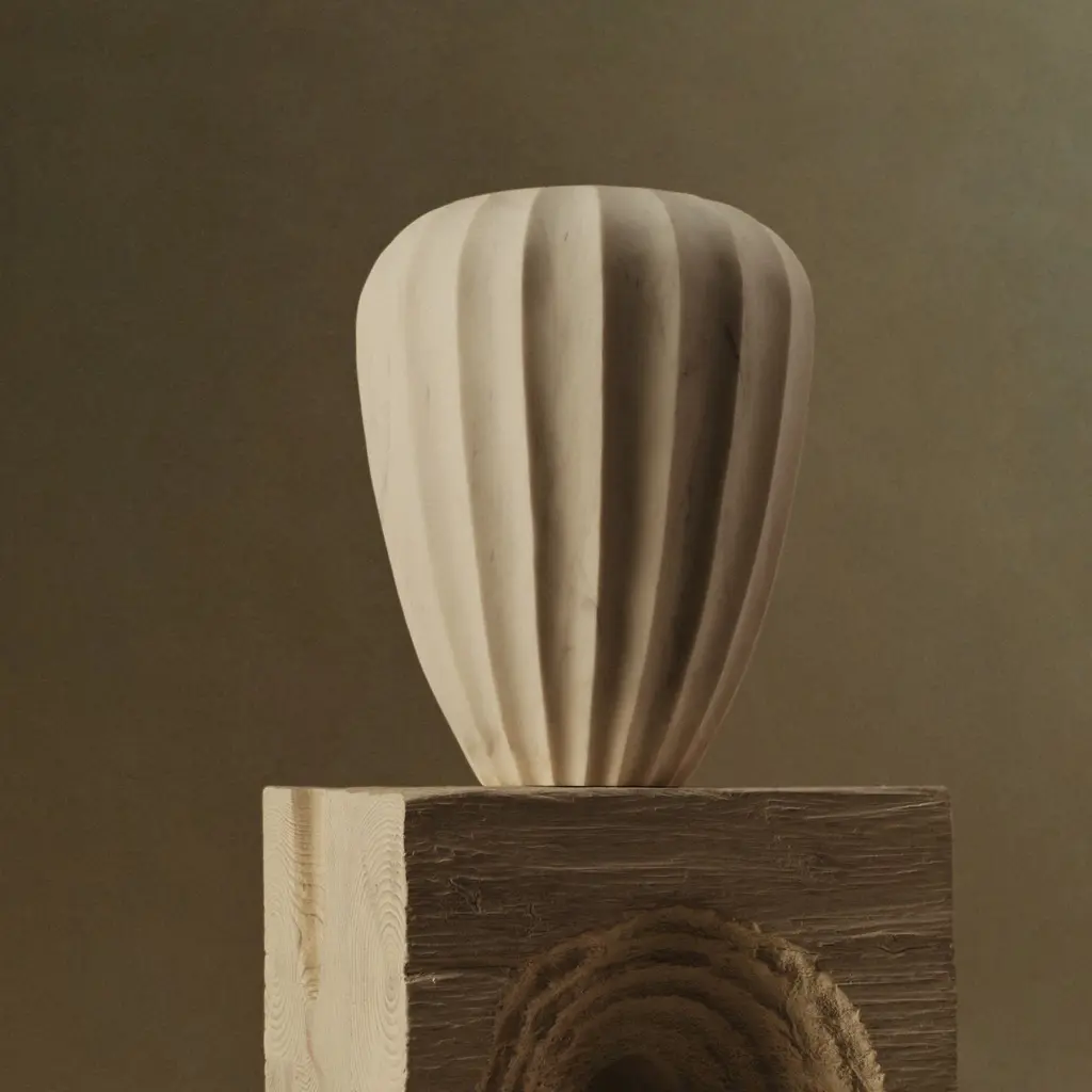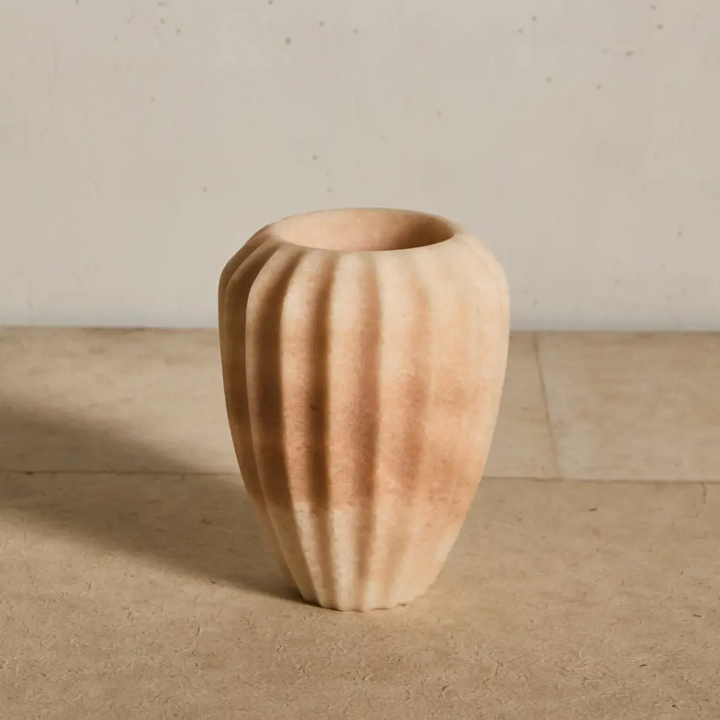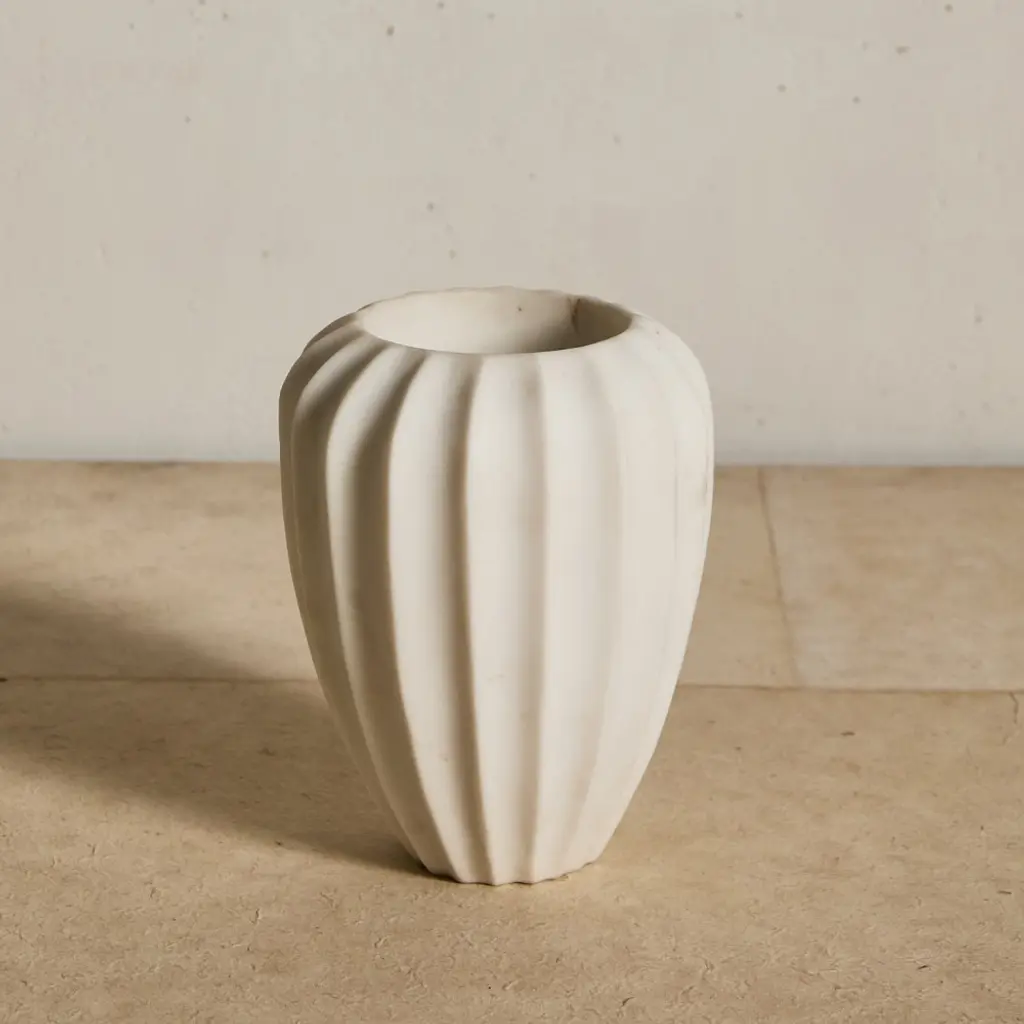 This sculptural vase is hand-carved from solid marble, the elegant fluting lending it a classical and timeless silhouette. Designed to hold a simple floral arrangement or to be displayed on their own, both sizes, standard and large, are available in a variety of marble colors including Nero Marquina, Blanco Macael, and Rossa Francia. Marble is a natural material so variations in markings and coloration will occur.