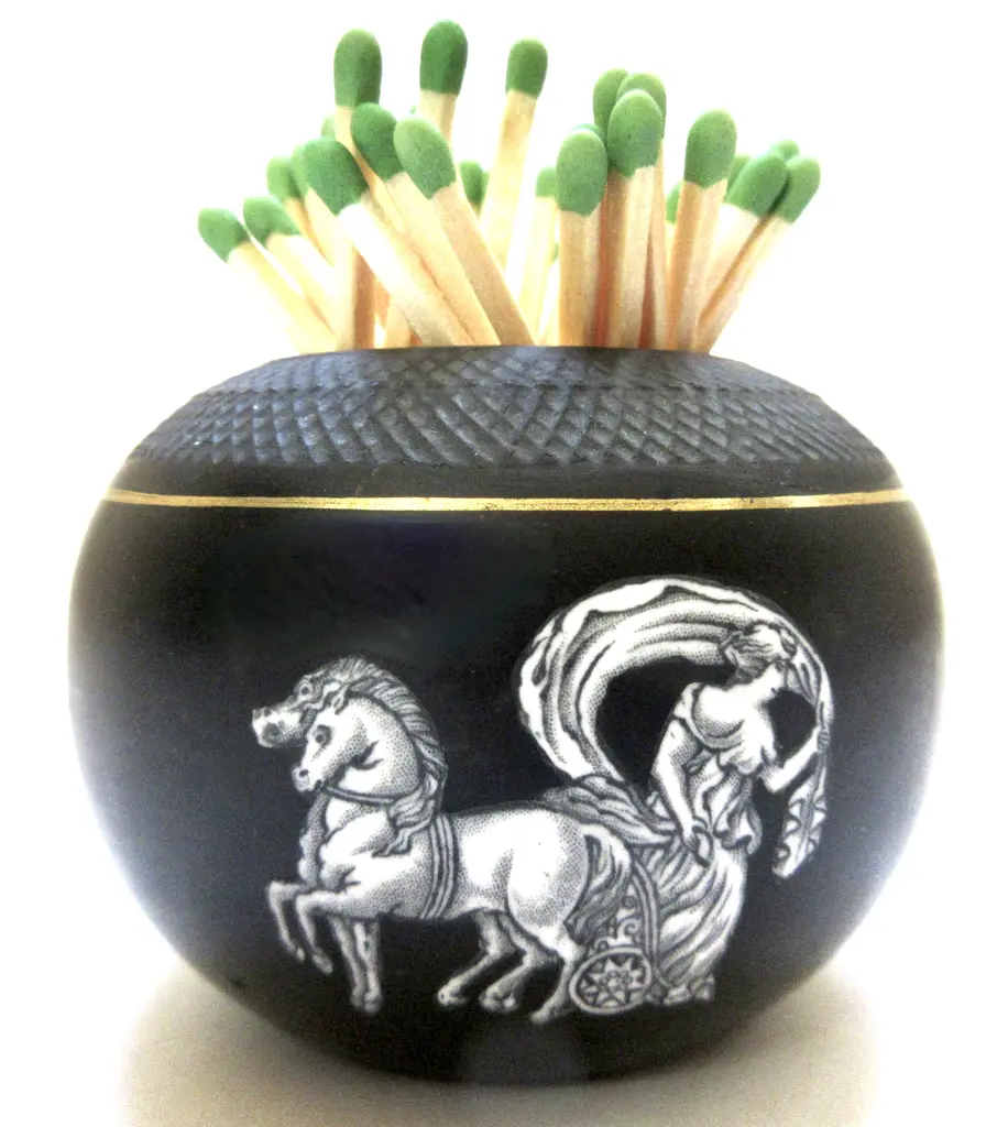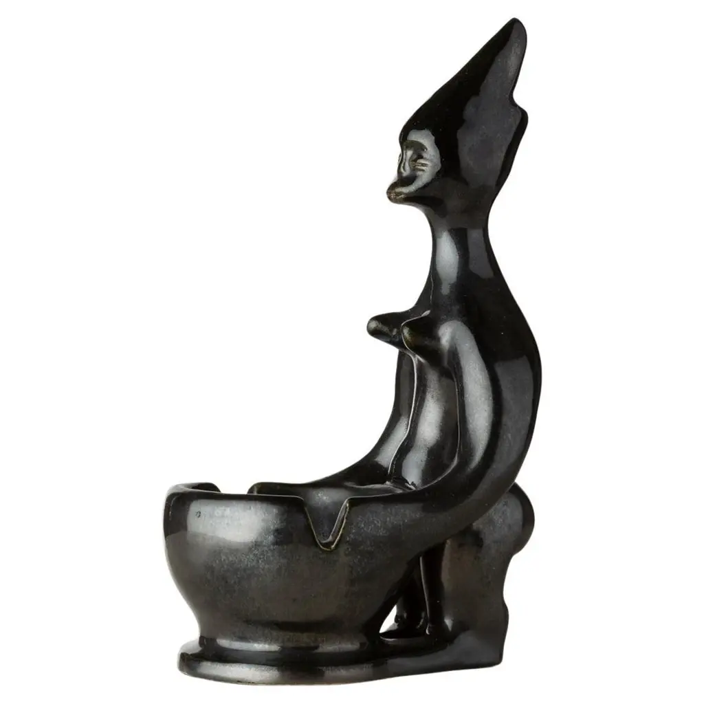 This piece, with its round shape, evokes the mystery of the rite of the bacchantes. This clay container is hand thrown with a matte black glaze finish decorated by hand with incisions, with a glossy black glaze lid. Designed by Jean-Christophe Clair.